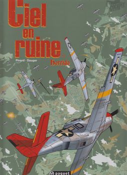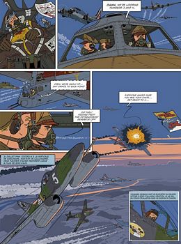 remarques: | album 2009 première édition titre horrido = cri de chasse, gehört zum jagdlichen Brauchtum und ist ein alter Gruß und Jagdruf aus der Jägersprache, der sich vom Hetzruf des Rüdemeisters beziehungsweise Rudelführers bei Meute- oder Treibjagden zum Anfeuern der Jagdhunde ableitet première page: reportage sur le M 262 par la deutsche Wochenschau alarmstart = départ immédiat des chasseurs première utilisation des missiles air-air qui se révèlent très efficace, nombreuses batailles aériennes mais les M 262 deviennent le gibier prioritaire de la chasse alliée, notamment des P 51 mustang qui guettent leurs proies (principalement les M 262) à leur décollage ou à leur atterrissage n.b. le Republic P-47 Thunderbolt fut l'un des principaux chasseurs américains et l'un des avions les plus produits de tous les temps avec plus de 15 000 exemplaires construits, les pilotes de l'Air Force le surnommèrent the Jug en raison de sa forme trapue évoquant un broc ou une cruche (stubby jug-like), il fut surnommé l'ogre de la seconde guerre mondiale; sa masse (il était le plus gros chasseur monomoteur à hélice de son époque) et son moteur radial moins vulnérable au combat permirent de l'utiliser comme chasseur-bombardier, malgré ses performances comme chasseur de pointe, il céda rapidement en Europe le rôle d'escorteur au P-51 Mustang qui avait un rayon d'action suffisant pour suivre les bombardiers américains sur tout le territoire allemand >> p. 25 le M 262 acheminé par deux vaches sur la base aérienne!! une armée allemande vraiment démunie >> p. 26 la beuverie au mess des officiers suite à une victoire aérienne >> p. 30/31 dissertation sur la guerre nouvelle mission pour les M 262 de Wedekind, arrêter l'avance soviétique sur le front est, des panzerfaust volant attaquent les T 34 mais son appareil endommagé, Wedekind doit effectuer un atterrissage de fortune >> un album dans la lignée de la série, un assez bon scénario et surtout à nouveau un excellent graphisme Annexes - couverture de l'album - une page de combats aériens - le P47 thunderbolt et le P51 mustang Information au début de l’année 1945, l’Allemagne est prise entre deux fronts: à l’Ouest, les alliés ont franchi le Rhin; à l’Est, l’armée Rouge se dirige vers Berlin, si l’espoir commence à abandonner les soldats de la Wehrmacht, quelques soubresauts de haute voltige animent encore un ciel désormais en ruine, les M 262, véritables tombeaux volants, sont pilotés par des hommes dont le courage frôle souvent l’inconscience, voire la folie Nikolaus Wedekind est l’un d’entre eux, s’il a jusqu’à présent échappé à la mort, c’est certainement grâce à ses qualités exceptionnelles… à moins que Fisto (Méphisto), un mystérieux chien doué de la parole, n’en soit la cause cet élément fantastique, présent depuis les premières pages de l’histoire, avait de quoi surprendre, deux albums plus tard, le diabolique canidé fait presque partie des meubles, et donne au récit un côté kitsch, peu compatible avec les atrocités de la guerre, l’autre fil rouge, concernant les conditions du décès du frère de Nikolaus, a lui aussi du mal à se délier, Philippe Pinard distillant les indices au compte-gouttes, demeurent des scènes de batailles aériennes rondement menées, une ligne claire très agréable, et un souci du détail, qui pourra cependant rebuter les néophytes, renforçant l’authenticité de l’ensemble |