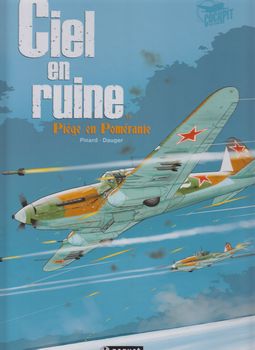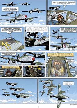 remarques: | première édition 2011, 2 ans après l'édition 2009 première page: les humeurs d'Hitler alors que la Luftwaffe a toujours les ailes brisées et que Nikolaus Wedekind fait un atterrisssage d'urgence en Poméanie, son 262 est hors d'usage mais Nikolaus réussit à s'en sortir, toutefois il est sans défence en Poméranie, ravagée par les avant-gardes russes >> p. 6 rencontre avec l'arrière-garde allemande: la division SS Charlemagne >> p. 7 les renforts attendus: quelques canons anti-char acheminés par attelages hippomobiles! >> p. 12 essayant de rejoindre son unité, Nikolaus se retrouve dans une forêt vivante >> p. 20 il est considéré comme déserteur par une patrouille allemande et va être exécuté selon la loi Schörner n.b. un général d'une fidélité indéfectible à Hitler et qui avait donné l'ordre de fusiller ou de pendre sans jugement les déserteurs ou faux permissionnaires pour l'exemple, il fera régner une discipline de fer au sein des unités qu'il commande >> p. 24 Nikolaus sauvé de la pendaison par des chasseurs russes >> p. 25 en route pour Hammerstein d'abord avec le cheval Rossinante puis en side-car avec la petite Christa coiffée d'un casque de grenadier! >> p. 29 l'attaque aérienne des chasseurs russes sur le train allemand finalement, après bien des mésaventures, Nikolaus arrive à rejoindre son unité en page 33 >> p. 33 la nouvelle tactique de combat: flèche agile et en fin d'album, une nouvelle dissertation peu compréhensible avec le chien Fisto et départ sur un nouveau M 262 muni de réacteurs plus puissants mais en poursuivant un P38, Nikolaus part en vrille grisé par la vitesse n.b. lorsque l'avion descend sous la vitesse qui lui apporte une sustentation minimale, il "décroche": il pique (rotation en tangage) et s'enfonce (translation verticale) de manière plus ou moins contrôlable n.b. le P 38 Lightning (foudre) surnommé par les allemands "der Gabelschwanz Teufel" (le diable à la queue fourchue), un admirable avion de chasse et de reconnaissance, à long rayon d'action, bimoteur, bipoutre (avion dont les gouvernes de queue ne sont pas installées sur le fuselage, mais rattachées aux ailes par un double longeron) mais monoplan (un seul pilote) >> un album pour faire durer la série, peu de combats aériens eet peu de M 262 cette fois, par contre un épisode western avec le cheval Rossinante et la petite fille Christa toutefois une première amélioration sur le vocabulaire allemand: le mot führer est corrigé et n'est plus écrit fürher en page 9 |