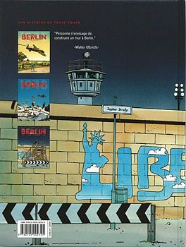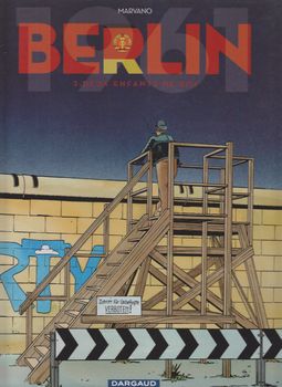 remarques: | Dargaud 2008, marqué premier édition avec le mot d'Ulbricht: personne n'envisage de construire un mur à Berlin ce troisième album a pour sujet principal le mur de Berlin >> page de garde, description sur la construction du Mur avec ses chicanes, tours de surveillance, fossé, électrisation, etc dont la superficie était appelée "death zone" c'est la suite de Reinhard le Goupil réfugié en France, peut'être sous le nom de Sergueï Vissarionovitch Unkovski qui se donna la mort après avoir servi dans la Stasi, la Gestapo d'Ulbricht, le tout raconté par un descendant de l'aviateur Stuart qui mène un enquête personnelle pas très compréhensible >> p. 16 à 21 Berlin 1961, description de la tension internationale, l'édification du fameux Mur, la menace nucléaire, the day after histoire de l'ancien aviateur Stuart, surnomé "der Schokolandenflieger" et son amour pour la jeune réfugiée allemande Helena >> p. 24 l'Alsace, une vieille pomme de discorde entre allemands et fançais >>une enquête peu intéressante tissée sur les personnages des deux premiers albums, c'est surtout un album didactique sur le Mur de Berlin >> p. 39 le Mur comme attraction touristique le moins bon album de la tryptique sur Berlin |