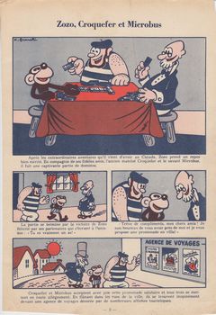 remarques: | album Zozo intégral éditon Touret 1946 comprenant les quatre premiers épisodes de Zozo (avec le capitaine Croquefer et le professeur Microbus): Zozo explorateur, Zozo en Amérique, Zozo en avion et Zozo inventeur >> des aventures loufoques et enfantines, mais plutôt originales et assez bien dessinées Information le personnage de Zozo est apparu dans le journal pour enfants le Journal de Francette et Riquet en 1934 ou 1935, sept albums (grand format, souple) ont été publiés de 1934 à 1941 et réédités après guerre, vers 1946-1948: Zozo explorateur, Zozo en Amérique, Zozo en avion, Zozo inventeur, Zozo roi des neiges, Zozo marin et Zozo officier Zozo, qui a les traits d'un singe, est accompagné dans ses aventures par un marin et un savant, certains albums reflètent très fortement les préjugés de leur époque, une tentative de relance du personnage vers 1973 a échoué et Zozo est ensuite tombé dans l'oubli de la part du grand public, le tome 8 Zozo chasseur n'est jamais paru |