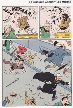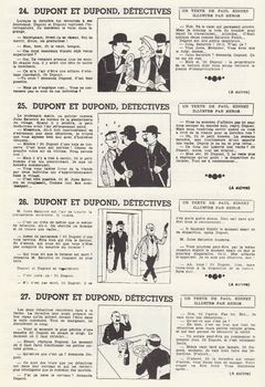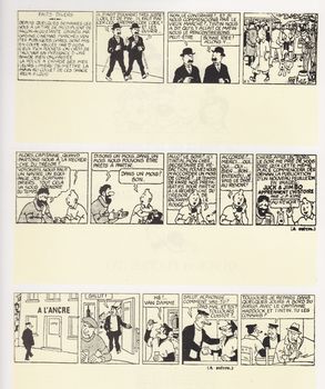 remarques: | sixième album Rombaldi sur l'oeuvre intégrale d'Hergé y inclus journeaux Rombaldi Club nos 3 et 7 (journal distribué gratuitement pour les lecteurs bédéphiles de Rombaldi) 1/ le secret de la Licorne et le trésor de Rackham le Rouge quintessence du récit d'évasion, ce double album traite du thème le plus romanesque qui soit: celui de la chasse au trésor, du château de Moulinsart au professeur Tournesol, les acquis sont quasiment innombrables, l'univers d'Hergé est désormais bien en place >> p. 6 les premiers strips des deux récits publiés dans le Soir juste après avoir été confronté à la limitation de longueur qui l'amène à rendre ses récits plus denses, Hergé semble saisi du désir de s'attaquer à de plus vastes fresques, il souhaite maintenant de raconter des histoires de plus large dimension et traiter des thèmes qui excèdent ce que l'on attendait à l'époque d'une bande dessinée, ene solution s'offre tout naturellement: raconter des histoires qui courant sur deux albums, ce seront le secret de la licorne et le trésor de Rackham le Rouge, les 7 boules de cristal et le temple du soleil ainsi que objectif lune et on a marché sur la lune Hergé maîtrisant parfaitement les techniques narratives, il réussira à mener parallèlement plusieurs histoires sans que la lisibilité de l'aventure soit jamais mise en péril, il contrôle également le fil général de son intrigue qu'il peut sans crainte s'en écarter ces deux premiers doubles albums seront plein d'imprévus, de rebondissement, d'idées neuves et de gags extrêmement plaisants et pour la Licorne, Hergé utilisera une maquette du musée de la Marine à Paris, tout comme d'ailleurs pour le chalutier Sirius >> p. 10/11 plan du vaisseau la Licorne établi peu après la guerre par le fabricant de jouets et de maquettes G. Liger-Belair >> p. 14 explications sur le nom du capitaine Haddock qui auraient eu trois ancêtres: un anglais, un français et un canadien et le forban Rackham le Rouge est inspiré d'un pirate tout ce qu'il y a de plus réel: Jean Rackham >> p. 16 et 19 description de Tryphon Tournesol et du château de Moulinsart (= le château de Cheverny amputé de ses deux ailes) prépublication dans Le Soir du 11.6.1942 au 14.1.1943 (secret de la Licorne) et du 19.2. au 23.9.1943 (Rackham le Rouge) >> p. 25 à 86 le secret de la Licorne, 61 planches >> p. 26 Van Melkebeke dessiné au Vieux Marché >> p. 39 à 50 l'histoire du chevallié, François de Hadoque, capitaine de la marine du Roy, commandant le vaisseau la Licorne >> p. 69 première apparition de Nestor >> p. 93 à 154 le trésor de Rackham le Rouge, 61 planches >> p. 97 première apparition de Tournesol atteint de surdité aigu 3/ Dupond et Dupont détectives c'est le 24 septembre 1943, soit le lendemain même de l'achèvement du trésor de Rackham le Rouge, que cette bande commença à paraître dans le Soir, sa publication s'y poursuivit jusqu'au 11 novembre il s'agit d'un travail tout à fait particulier, resté sans équivalent dans l'oeuvre d'Hergé puisque les deux détectives (à l'exclusion d'ailleurs des autres personnages de la série) s'étaient trouvés empruntés à leur créateur par l'écrivain Paul Kinnet, auteur de nombreux romans policiers dans les années 30-40, fort peu connus, ces 40 illustrations réalisées par Hergé ne manquent pourtant pas de charme >> p. 158 à 167 10 planches des Dupondt détectives n.b. une publication tout à fait inédite par Rombaldi mais le récit en lui-même n'est guère intéressant 4/ Quick et Flupke, 4ème, 5ème, 6ème et 7ème série longtemps dans l'ombre du fait même de la notoriété de Tintin, cette attachante série connait aujourd'hui (1985) un nouveau départ grâce à la télévision, produit par Johan de Moor, l'artisan numéro un de ce projet depuis 1940, aucun nouveau gag de Quick et Flupke n'avait été créé et il semble que les choses soient en train de changer à cet égard, un important programme de dessin animés venant d'être mis en chantier; sur les 260 petits films prévus, la moitié sera basée sur des scénarios originaux, parallèlement avec une série d'albums qui paraîtront dans une présentation renouvelée >> p. 176 à 287 avec la fameuse planche p. 275 de la musique qui adoucit les moeurs >> un album à nouveau de grand intérêt, particulièrement sur Dupond et Dupont détectives dont l'origine et la bande dessinée ne furent que très peu abordées dans les ouvrages d'étude du monde de Tintin annexes - couverture de l'album - exemples de strips parus dans Le Soir - réclame pour le château de Cheverny - une planche de Dupond et Dupont détectives - portrait de l'agent 15 - Quick et Flupke, couverture édition couleur - une planche de la 6ème série - exemplaire du journal Rombaldi Club |