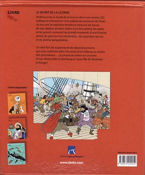 remarques: | livre animé faisant partie d'une série éditée par Moulinsart, une version en 3D, interactive qui renoue avec l'initiative des studios Hergé qui a créé entre 1969 et 1971 une série d'albums animés appelés à l'époque pop-hop, mais cette réédition dans le genre pop-hop n'atteint absolument pas la qualité et la perfection de la série pop-hop originale, imprimée en Thaïlande seuls 3 albums ont été édités par Moulinsart dans ce genre: 1/ le secret de la Licorne 2/ le trésor de Rackham le Rouge 3/ le crabe aux pinces d'or seul le premier album est collectionné ici |
