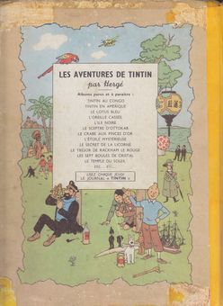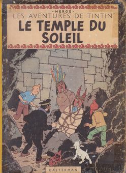 remarques: | Tintin, le temple du soleil, 2ème choix, B3 1949, côté BDM € 300.- dernier titre au 4ème plat: le temple du soleil (EO = B3 1949 avec deux symboles incas) mauvais état à état moyen, intérieur bien complet non déchiré, tranche dos DJ complet mais refait n.b. il y a deux EO de même date B3 1949 avec au troisième titre le lotus bleu (12 titres), mais le véritable EO comporte deux symboles incas >> commentaires voir section Tintin albums EO |