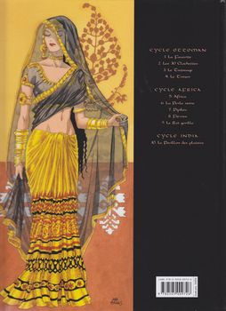 remarques: | le cycle Africa est maintenant terminé, mais les secrets de la perle noire et du sultan noir ne sont pas encore révélés le début de l'album se dévoile en bleu et Jade (plutôt couleur verte) se présente chez la rani Gaya Bashodra qui confie à Jade l'éducation sensuelle de son fils, le maharadjah d'Eschnapur, ami des anglais, et de Tamila, sa future belle-fille, fille de radjah Singh, ennemi farouche des anglais à cet effet, Jade reçoit la clé du pavillon des plaisirs n.b. Jade arrive en compagnie de lady et lord Nelson, miraculeusement réchappés de la profonde jungle africaine >> p. 19 les fresque érotiques du pavillon >> p. 26 le harem hindou >> p. 29 la contemplation de Tamila mais en l'occurrence, Jade, la djinn, a une rivale en la personne d'Arbacane, la favorite du harem >> p. 44/45 le piège manqué tendu à radjah Singh durant la chasse au tigre >> ce premier album est une vraie partie de plaisir sado-érotique où il est même fait mention de Gandhi, mais ce n'est malgré tout pas une réussite sauf pour le graphisme qui montre toutefois déjà quelque signe de défaillance et la suite de la série ne sera plus collectionnée ici, il y aura encore trois autres albums de ce cycle: - une jeunesse éternelle (2012) - un honneur retrouvé (2014) - Kim Nelson (2016) il n'y aura pas de suite, toutefois il y eut a) le cycle ottoman b) le cycle Africa c) le cycle India + trois albums hors série: 1/ ce qui est caché 2/ notes sur Africa 3/ le coeur de Djinn Information (petit résumé de l'histoire coloniale des Indes) l'Inde manifesta un parfait loyalisme à l'égard de l'Angleterre de 1914 à 1918, 1,300,000 indiens combattirent vaillamment dans les Flandres et au Proche-Orient, aussi beaucoup d'indiens espéraient-ils que l'Angleterre, à la fin des hostilités, accorderait l'autonomie interne à l'Inde de fait, en août 1917, Montagu, secrétaire d'état pour l'Inde, promit une participation accrue des indiens au gouvernement local afin que puisse être institué un gouvernement indien autonome au sein de l'empire britannique mais en 1919, à la suite de grèves et de diverses manifestations révolutionnaires, les autorités anglaises firent brusquement machine arrière et promulguèrent des mesures d'exception, Gandhi (déjà lui) répliqua en appelant les indiens à observer "l'hartal", c'est à dire la suspension de tout activité pendant un jour, une manifestation de protestataires non-violents fut brisée par le général Dyer qui provoqua le massacre d'Amritsar en ordonnant à ses troupes de tirer sur la foule, cet incident provoqua une rupture irréparable entre les britanniques et les nationalistes indiens durant les années suivantes, Gandhi s'efforcera de mener de front la rénovation politique, morale et spirituelle du peuple indien, mais à côté de ce mouvement commencent à s'affirmer des tendances plus radicales conduites par Nehru et Subash Chandra Bose, le parti communiste indien voit le jour en 1924 |