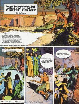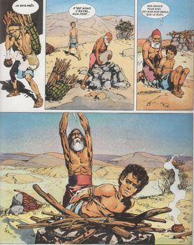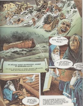 remarques: | une superbe collection de 8 volumes (6 sur l'Ancien Testament, 2 sur le Nouveau Testament) illustrés par des maîtres-dessinateurs de la bande dessinée voir aussi la documentation dans dossier 505 la bible tome 1 de découvrir la Bible, Ancien Testament la création, la Genèse, les Patriarches, prologue la Bible du grec biblia = les livres = ensemble de livres dont: a) la loi (la Torah), en cinq rouleaux: la Genèse, l'Exode, le Lévitique, les Nombres et le Deutéronome b) le livre des Inspirés (juges et prophètes dont Isaïe) c) le livre des Sages (par exemple les proverbes) d) les livres judeo-chrétiens ou apocryphes (exemple: le livre de Tobie) n.b. ces 4 derniers livres concernant l'Ancien Testament e) les livres chrétiens du Nouveau Testament dont les Evangiles 1/ la création par Serpieri le Genèse: lumière, cieux, mer, terre, végétaux, animaux et enfin l'homme avec Adam et Even, Caïn et Abel, Lamech = descendant de Caïn, Yabal, Youbal et Tubal = descendants de Lamech, Seth = descendant d'Eve, adorateur du soleil, Noé et son arche avec ses fils: Japhet, Sem et Cham, Abraham = descendant de Sem, la tour de Babel, Babylone, Sin = déesse de la lune, Ishtar = déesse babylonienne de l'amour et de la guerre, le serpent = Satan = le mal 2/ Abraham vers 1800 BC par La Fuente la marche d'Abraham et de Lot, son neveu depuis Ur à Haran, Sarah, femme d'Abraham, n'a pas d'enfant, Hagar, la servante d'Abraham lui donne un enfant, ce sera Ismaël, l'ancêtre des arabes, destruction de Sodome et Gomorrhe, Sarah avec l'aide de Dieu donnera finalement un enfant à Abraham, ce sera Isaac, le sacrifice d'Abraham, Rebecca marie Isaac, les fils d'Isaac: Esaü et Jacob, le droit d'aînesse Melchisélech, roi de Salem qui deviendra Jerusalem, Abimélech, roi des philistins 3/ Isaac et Jacob par Poïvet Esaü perd son droit d'aînesse à Jacob (par supercherie déjà!), Jacob prend Lea puis Rachel comme épouses, Rachel met au monde deux fils: Joseph et Benjamin Jacob, après son combat avec l'ange, est nommé Israël = force de Dieu 4/ l'histoire de Joseph par Bielsa ses frères vendent Joseph à des marchands égyptiens, la femme de Potiphar courtise Joseph qui refuse et est puni, les songes de pharaon, Joseph devient l'intendant de pharaon, Joseph fait venir son père et ses frères en Egypte au pays de Goshen, Joseph épouse Asnath, les deux fils de Joseph: Manassé et Ephraïm, >> p. 140 description des 11 frères de Joseph qui formeront les 12 tribus d'Israël: Juda, Ruben, Siméon et Lévi, Zabulon, Issachar, Dan, Gad, Ascher, Nephtali et Benjamin >> un permier volume intéressant surtout de par le graphisme de quelques maîtres de la bande dessinée (bible: livres de la Genèse, chapitres 1 à 50) |