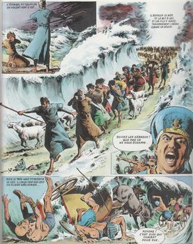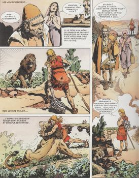 remarques: | tome 2: Moïse, Josué, les Juges, Déborah, Gédéon, Jephté, Samson (l'exode, le Lévitique, les Nombres, le Deutéronome, le livre de Josué, le livre des Juges) - les noms de Dieu: je suis ce que je suis = Yahwe = Adonaï (mon seigneur) = l'Eternel >> voir aussi la documentation dans dossier 505 la bible 1/ Moïse (trois épisodes par Carlo Marcello) - par ordre de pharaon, les mâles nouveaux-nés des hébreux sont jetés dans le Nil pour empêcher leur accroissement en nombre, Moïse (= sauvé des eaux) est recueilli et élevé par la fille du pharaon Ramsès II, Dieu apparait à Moïse pour sauver son peuple, les 10 plaies d'Egypte, l'exode d'Egypate, la traversée de la mer Rouge, les dix commandements ou tables de la loi, Aaron et Josué assistent Moïse, le veau d'or, la malédiction de Moïse, la manne qui tombe du ciel, Moïse marie Sephora, fille de Jethro mais n'aura pas de descendant connu, ce seront Aaron, frère et Myriam, soeur de Moïse qui prendront la suite avec Eleazar, fils d'Aaron - Moïse ne peut tout seul administrer les Hebreux et nomme des Juges, un juge par tribu qui seront au nombre de douze: Ascher, Benjamin, Dan, Ephraïm, Gad, Issachar, Juda, Manassé, Nephtali, Ruben, Simeon (et Lévi) ainsi que Zabulon - l'arche d'alliance contenant les tables de la loi est confiée à Aaron, Josué devient le chef militaire, Aaron et Moïse provenaient de la tribu de Levi (les Lévites) à qui par la suite fut confiée l'arche d'alliance - les hébreux s'installent dans le pays de Moab, la tentation des filles de Moab qui détournent les fils d'Israël de leur Dieu, ce furent les révoltés - mort de Moïse au mont Nebo en laissant la Torah (loi de Moïse) à son peuple, Dieu désigne à Moïse le nom de son successeur = Josué qui prend le commandement du peuple d'Israël - mais il ne paraîtra plus en Israël de prophète semblable à Moïse (sauf Jésus si celui-ci est considéré comme prophète) 2 Josué par Pierre Frisano - Josué conquiert le pays de Canaan (pays où coule le lait et le miel) dans la plaine du Jourdain, les guerres de Josué, prise des villes de Jéricho (les trompettes de Jericho), de Béthel, Aï, Sichem, Gabaon et Kefira, Josué partage le pays de Canaan entre les douze tribus >> p. 227 Jéricho est soumise à l'anathème n.b. anathème, dans l'Ancien Testament = sacrifice à une divinité par destruction totale en guise d'expiation ou livré à sa vengeance, dans le cas présent, l’anathème comporte le renoncement à tout le butin et son attribution à Dieu: les hommes et les animaux sont mis à mort, la ville est incendiée et les objets précieux sont donnés au sanctuaire, c’est un acte religieux, une règle de la "guerre sainte" qui suit un ordre divin, ou un vœu pour s’assurer la victoire, tout manquement est considéré comme un sacrilège et son auteur sévèrement puni l'Eglise dans les temps modernes en fera l'excommunication 3/ les Juges (2 épisodes par Victor de La Fuente) - mention de Nathanaël (gift of god) qui est inconnu dans le livre de l'ancien testament, les nations habitant alors la Terre Promise: les Philistins (sur la côte), les Cananéens, les Amorréens, les Ammonites, les Moabites et les Edomites - après le règne de Othniel, successeur de Josué, le peuple d'Israël se détourne de Dieu, Israël subit alors le joug d'Eglon, roi de Moab, Ehud, de la tribu de Benjamin, délivre Israël du roi Eglon - Deborah, la prophétesse, nomme Barak, chef de l'armée pour battre Yabin, roi de Hatsor - nouveau détournement de Dieu par les hébreux qui retombent sous le joug des Madianites, Gédéon, fils de Joas, reprend la lutte contre l'oppresseur mais Abimélech, fils de Gédéon assassine ses frères pour devenir roi, guerres d'Abimélech qui est tué par une femme lors du siège de Tebets - un chef de bande, Jephté, délivre Israël de la menace des Ammonites et devient chef d'Israël >> p. 271 la promesse de Jephté en cas de victoire: sacrifier sa fille 4/ Samson par Victor de La Fuente - Samson, fils de Manoah, devient un nazir (homme consacré à Dieu qui ne se coupe pas les cheveux) >> p. 279 la force de Samson, l'énigme de Samson >> p. 287 la trahison de Dalila - lutte contre les philistins et mort de Samson, rendu aveugle par ses ennemis, en faisant croûler les colonnes du temple des philistins >> un deuxième volet bien présenté avec le chapitre des Juges moins connu que Moïse et Samson et toujours admirablement illustré par de célèbres dessinateurs bd |