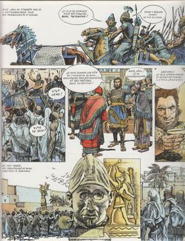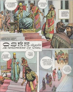 remarques: | 4ème volet de découvrir la Bible, l'Ancien Testament prophètes en Juda et Israël (Elie, Elisée, Amos, Osée et Isaïe) en couverture: Elie qui monte au ciel sur son char de feu (premier et second livre des Rois, Amos, Osée, Isaïe) >> p. 434 au lendemain de la mort de Salomon en 932 BC, une révolution éclate, entraînant la division du pays d'Israël en deux royaumes: - celui du nord, capitale Samarie - celui du sud, capitale Jérusalem le premier plus vaste et plus puissant, conserve la plupart des lieux saints des patriarches rois d'Israël: Omri, Achab, Joram, Ochozias, Jéhu, Joachaz, Joas, Jeroboam II, Menahem et Osée Ben-Ela rois de Juda: Asa, Josaphat, Joram, Ochozias, Athalie, Joas, Amasias, Ozias, Yotam, Achaz et Ezechias n.b. sous Omri, le royaume d'Israël devient aussi le royaume de Samarie >> voir aussi la documentation dans dossier 505 la bible 1/ Elie, le prophète par Victor La Fuente - Roboam, fils de Salomon, s'apprête à succéder à son père alors que Jéroboam, ancien intendant de Salomon, revient de son exil égyptien, les provinces du nord (Israël) se détachent de Roboam et y installe Jéroboam, profitant de cette dissenssion, Sheshong, pharaon d'Egypte, envahit Juda et Israël - naissance d'Eli-Yahu (= Adonaï est £Dieu), ce sera le nouveau Moïse - Achab, roi d'Israël, épouse Jézabel, la phénicienne, qui veut introduire en Israël les dieux de Baal, Elie annonce à Achab que Dieu le punira si il laisse faire Jézabel, mais Elie doit peu après se cacher de la colère du roi Achab >> p. 446 les corbeaux qui apportent la nourriture à Elie >> p. 449 le jugement d'Elie au mont Carmel (soit Dieu soit Baal) - Elisée devient le serviteur d'Elie, Elie retourne au mont Sinaï pour écouter la parole de Dieu 2/ Elisée par Bielsa - le crime envers les vignes de Naboth par le roi Achab mais imaginé par Jézabel, réconciliation entre Juda et Israël sous les rois Josephat et Achab, Achab meurt au combat et Ochozias, son fils, doit se battre contre les Assyriens, Ochozias meurt et son frère Joram prend le pouvoir >> p. 470 la mort d'Elie emporté par un char de feu, Elisée prend sa succession >> p. 472-478 les miracles et les prophéties d'Elisée - Jéhu est consacré roi d'Israël par Elisée et se prépare à détrôner Joram alors que les Assyriens sous Salmanasar III se prépare à conquérir la Syrie (840 BC) 3/ rois de Juda et rois d'Israël, la reine Athalie et le prophète Amos par Bielsa - Jéhu élimine Joram, roi d'Israël et Ochozias, roi de Juda, Jéhu prend le pouvoir et fait exécuter Jézabel, il fait aussi place nette en éliminant tous les descendants d'Achab et les prêtres de Baal (page 488), Jéhu fait ainsi disparaître complètement le culte de Baal en Israël - pour préserver son trône, Athalie, fille de Jézabel à Jérusalem, fait tuer tous les fils d'Ochozias mais Joas, un des fils, échappe au massacre et est élevé par le grand-prêtre Joïda et à son tour, la reine Athalie est exécutée lors d'une révolte de son peuple - Joas prend le pouvoir en Juda et Joachaz, fils de Jéhu, en Israël, Joachaz, assiégé par les Syriens à Samarie, est sauvé par Elisée et les lépreux, Elisée guérit de la lèpre Naaman, chef de l'armée syrienne - Joas succède à Joachaz en Israël et fait alliance avec Elisée, Joas de Juda (il y aurait eu deux Joas!) succède à Athalie mais se fait assassiner un peu plus tard, son trône est repris par son fils Amasias qui déclare la guerre aux Edomites et à Joas, roi d'Israël, Amasias est battu 4/ Amos, un berger prophète par Marcello - Jeroboam II est roi d'Israël et Amasias est resté roi de Juda, les deux royaumes vivent en paix, Jonas le prophète prédit à Jeroboam un règne riche et victorieux, Jeroboam pacifie et enrichit Israël en y introduisant des réformes, toutefois pas toujours très sociales, Ozias succède à Amasias, assassiné; Ozias se révèle un bon souverain , la prospérité s'établit à nouveau dans les deux royaumes >> p. 516 l'abondance des richesses finit par étouffer les hommes - Amos critique les grands seigneurs d'Israël et de Juda, après avoir prophétisé des jours sombres pour Israël, Amos disparut et on n'entendit plus parler de lui mais ce fut l'un des premiers prophètes qui ait mis par écrit ses oracles 5/ les prophètes Osée, Michée et Isaïe (= Dieu sauve), Osée chante la tendresse de Dieu par Poïvet - Jeroboam mort, Zacharie monte sur le trône d'Israël, Osée demande la main de Gomer, fille de Diblaïm, un enfant leur est né: Jizréel, Zacharie est assassiné, Ménahem prend le pouvoir - l'assyrien Teglath Phalasar III, s'empare de la Syrie et d'Israël, Menahem, roi d'Israël doit maintenant lui payer tribut, le royaume de Juda reste à l'écart mais des luttes internes se déclanchent, Israël et la Syrie, alliés momentanés, assiègent à Jérusalem, le roi Achaz, successeur de Ozias, Osée et Isaïe défendent le roi Achaz et Osée déclare "qui sème le vent, récolte la tempête" - Salmanasar reprend la lutte contre Israël, son successeur, Sargon II, s'empare de Samarie et une grande partie des survivants sont déportés en Assyrie (construction du palais de Khorsabad, 721 BC) 6/ le prophète Isaïe par Bielsa - la vie d'Israël, les prophéties d'Isaïe >> p. 562 Achaz qui sacrifie un fils à Moloch! - Ezechias succède à Achaz, roi de Juda et fait alliance avec Isaïe, - Michée, jeune prophète devient l'assistant d'Isaïe, une armée assyrienne sous Sennachérib parvient aux portes de Jérusalem mais décimée par la peste, elle doit se retirer >> quelle salade avec ces rois et prophètes mais un récit toujours bien expliqué et surtout de superbes illustrations Annexes - couverture de l'album avec le prophète Elie - les royaumes d'Israël et Juda |