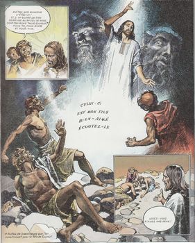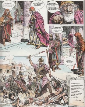 remarques: | tome 1 (7) de découvrir la bible , Nouveau Testament >> voir aussi documentation bible/Jesus dossier 505 Jesus de Nazareth avec Jean-Baptiste, en Galilée avec les Douze, en pays païen, la montée à Jérusalem, la Passion actes et paroles de Jésus de Nazareth transmis par les apôtres et rédigés par les évangélistes, actes et lettres des communautés chrétiennes les quatre évangélistes: - Matthieu, traduira l'évangile en grec - Marc, porte-parole de Pierre - Luc, disciple de Paul et médecin, écrira l'évangile de la joie parfaite - Jean, décrira l'Apocalypse 1/ Jean-Baptiste et Jésus par Serpieri - Zacharie et Elisabeth recoivent un enfant: Jean le Baptiste - Marie, fille d'Anne, femme de Joseph et cousine d'Elisabeth reçoit un enfant du Saint-Esprit, ce sera Jésus = Yeshoua en hébreu = Dieu sauve Satan est l'adversaire traditionnel - naissance à Bethléhem de Jésus lors du grand recensement d'Auguste, visite des trois rois-mages: Malchior, Gaspard et Balthazar, la fuite en Egypte - à la mort d'Hérode, ses trois fils: Philippe, Archelaus et Hérode Antipas lui succèdent, des troubles éclatent, les légions romaines interviennent, Archelaus est exilé et la Judée mise sous juridiction romaine avec Ponce Pilate comme procurateur, Philippe reçoit l'Iturée et Hérode Antipas la Galilée-Pérée - Jésus a 15 ans, Joseph est mort et Jean-Baptiste prophétise dans les eaux du Jourdain 2/ Jésus en Galilée par Serpieri - Jésus passe 40 jours dans le désert tenté par le démon, puis Jean, André et Simon se joignent à Jésus, Jean-Baptiste est arrêté, Philippe rejoint le groupe, Simon devient Pierre (Simon-Pierre), - les noces de Cana >> p. 897 aucun prophète n'est bien reçu dans sa patrie - les miracles de Jésus, Matthieu, l'intendant des douanes, devient le cinquième disciple >> p. 906 il y a plus de joie pour un pécheur qui se repent que pour 99 justes qui n'ont pas besoin de se repentir - le sermon sur la montagne avec les 12 apôtres: Pierre, André, Jean, Jacques, Philippe, Barthélémy, Matthieu, Thomas, Jacques fils d'Alphée, Simon le zélote, Jude fils de Jacques et Judas l'Iscariote (apôtre = envoyé de Dieu) >> p. 910 la guérison du serviteur du centurion: "je ne suis pas digne de te recevoir, donne seulement un ordre et il sera guéri" - description de Jésus: un ascète qui dépendait de la générosité d'autrui, appelé aussi prophète, rabbi, Christ, fils du Dieu vivant, fils de l'Homme mais il n'aimait pas le titre de Messie ou fils de David 3/ Jésus et les Douze par Bielsa - conflit avec les pharisiens, la parabole du semeur, Jésus réveille les morts, Jean-Baptiste décapité sur l'ordre d'Hérode influencé par Salomé et Hérodiade (n.b. la tête de Jean-Baptiste n'est pas dessinée) - la multiplication des pains - Jésus marche sur les eaux, Pierre essaie de le rejoindre mais échoue "homme de peu de foi" selon Jésus 4/ Jésus en pays païen par Frisano >> p. 939 contradiction concernant les petits chiens (= les païens?) >> p. 942 les derniers seront les premiers et les premiers seront les derniers chapitre de la tragédie de Jésus I.N.R.I. = Iesus Nazarenus Rex Iudaeorum Christ = messie = sauveur 5/ la montée à Jérusalem par Frisano - l'histoire du bon samaritain - l'histoire de Marie-Madeleine "que celui qui n'a jamais péché lui jette la première pierre" - la résurrection de Lazare - Jésus chasse les marchands du temple, toutefois Jésus n'est pas prophète en son pays et il n'est pas toujours d'accord avec la Torah (la loi de Moïse) d'où la haine des pharisiens pour Jésus >> p. 976 faire passer un chameau dans le trou d'une aiguille (un bon exemple de proverbe) 6/ la Passion par Frisano - le dernier repas (la sainte Scène), la trahison de Judas, - Jésus est arrêté et mené chez Anne, beau-frère du grand prêtre Caïphe, puis conduit chez Caïphe, au Sanhédrin (tribunal religieux) qui le renvoie à Ponce-Pilate, seul habilité à condamner un homme à mort, Ponce-Pilate retourne Jésus à Hérode Antipas, car Jésus étant originaire de Nazareth en Galilée est sous la juridiction d'Hérode Antipas, celui-ci ne pouvant rien en tirer, le renvoie à Ponce-Pilate! - Barabbas est relâché à la place de Jésus qui est flagellé, puis condamné à la crucifixion par le peuple, Ponce-Pilate s'en lave les mains - Jésus est mis au tombeau, mais trois jours plus tard, Marie Salomé et Marie la magdaléenne trouvent le tombeau vide >> toujours un album de bon fracture et bien dessiné (surtout par Serpieri) mais un thème bien sûr très connu |