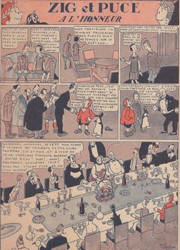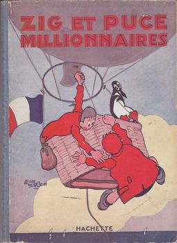 remarques: | le deuxième volume de la série qui compte 17 volumes sur la période 1927 à 1952, une des premières bandes dessinées à introduire des ballons dans les vignettes un style plutôt naïf, mais au graphisme particulier avec les personnages de Zig et Puce (celui qui a les cheveux ébouriffés) et leurs compagnons qui apparaîtront dans les prochaines aventures: le pinguin Alfred et le cheval Marcel liste des albums Zig et Puce: 1/ Zig et Puce en route pour l'Amérique (1927) 2/ Zig et Puce millionnaires (1928) 3/ Zig, Puce et Alfred (1929) 4/ Zig et Puce à New York (1930) 5/ Zig et Puce cherchent Dolly (1931) 6/ Zig et Puce mécanos (découpages) 7/ Zig et Puce aux Indes (1932) 8/ Zig, Puce et Furette (1933) 9/ Zig, Puce et la petite princesse (1934) 10/ Zig et Puce au XXIème siècle (1935) 11/ Zig et Puce ministres (1938) 12/ Zig et Puce et le professeur Médor (1941) 13/ revoilà Zig et Puce (1947) 14/ Zig et Puce et l'homme invisible (1949) 15/ Zig et Puce et le complot (1950) 16/ Zig et Puce et le cirque (1951) 17/ Zig et Puce en Ethiopie (1952) Information Zig et Puce est une série de bande dessinée créée en 1925 par Alain Saint-Ogan cette série paraît initialement dans le Dimanche illustré, supplément hebdomadaire pour la jeunesse du quotidien L’Excelsior, Alain Saint-Ogan crée, à la demande de Henry de Weindel et Camille Ducray, responsables d'édition, les personnages de Zig et Puce pour remplacer au dernier moment une page de publicité manquante à la dernière page dans le Dimanche illustré, supplément dominical au journal L’Excelsior la série Zig et Puce fait ainsi, par hasard, ses débuts dans le n° 11 du 3 mai 1925 d'abord une suite de gags, la série se transforme graduellement en récits d'aventure plus structurés dans le no 148 du 27 décembre 1925, Zig et Puce font la connaissance du pingouin Alfred qu'ils adoptent les lecteurs écrivent en masse et réclament leur présence plus régulière, ce qui sera fait dès le no 202 du 9.1.1927, Zig et Puce sont les premiers héros d'expression française à s'exprimer par bulles de façon régulière, à partir de 1927, le pingouin Alfred déclenche un phénomène de mode sans précédent, faisant l'objet, peut-être pour la première fois, de produits dérivés, il devient la mascotte de différentes personnalités, dont: - Mistinguett, chanteuse française, qui s'affiche avec une peluche à l'effigie d'Alfred - Charles Lindbergh, aviateur américain, qui, à son arrivée à Paris lors de sa traversée historique de l'Atlantique en avion en solitaire, reçoit d'une dame américaine une peluche à l'effigie d'Alfred qu'il installera dans la carlingue de son avion en repartant de Paris pour Bruxelles - Gaston Doumergue, président de la République française la réplique "t'as le bonjour d'Alfred", dite régulièrement après que Zig et Puce ont défait un adversaire, devient une expression du langage courant utilisée lorsqu'on vient de donner une leçon à quelqu'un la série Zig et Puce sert de modèle à Hergé, jeune débutant, créateur de Tintin qui vient rendre visite à Alain Saint-Ogan à Paris en 1931 pour lui demander conseil, on peut reconnaître l'influence de Zig et Puce dans la série Quick et Flupke d'Hergé la série Zig et Puce connaît ainsi un grand succès jusqu'à un premier arrêt en 1956, elle est reprise, en accord avec Alain Saint-Ogan, par Greg qui la modernise, entre 1963 et 1970 dans le Journal de Tintin, en 1974, Alfred devient la mascotte du Festival international de la bande dessinée d'Angoulême synopsis Zig et Puce cherchent par tous les moyens à atteindre l'Amérique pour y devenir millionnaires, mais leur voyage est souvent contrarié, soit par manque d'argent, soit par accident, il s'ensuit qu'ils voyagent partout dans le monde en cherchant toujours à atteindre l'Amérique, c'est lors d'un de ces voyages, où ils se retrouvent au Pôle Nord, qu'ils rencontrent Alfred qui les accompagnera ensuite dans leurs pérégrinations, originaire de l’hémisphère nord, Alfred est donc bien un pingouin (et plus exactement un petit pingouin, la seule espèce subsistante du genre Alca), contrairement à la majorité des personnages dessinés animaliers ultérieurs de la même apparence, qui sont généralement des manchots, certes, ayant des ailes atrophiées, Alfred ne peut voler (sauf quand un savant lui greffe des ailes de cigogne), alors que les pingouins en sont parfaitement capables, il ne peut pourtant pas être un manchot, car ceux-ci vivent uniquement dans l'hémisphère sud et de plus il ne ressemble à aucune des dix-huit espèces de manchots notons cependant qu'il n'a pas non plus vraiment l'aspect du petit pingouin, ayant un curieux bec spatulé qui n'est ni celui d'un pingouin, ni celui d'un manchot, le dessinateur Alain Saint-Ogan semble donc avoir imaginé un drôle de pingouin, unique en son genre annexes - couverture du tome 2 - une planche qui ressemble beaucoup à celle parue dans Tintin en Amérique - couverture du premier volume de Zig et Puce |
