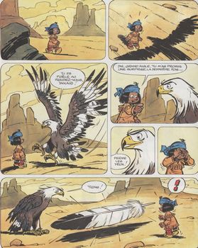 remarques: | premier volume des aventures de Yakari, des récits charmants et de jolies illustrations par Derib Yakari essaie de ressembler à Grand Aigle, son totem-protecteur, durant une chasse aux chevaux sauvages, le jeune mustang Petit Tonnerre échappe aux chasseurs, Yakari reçoit le don de pouvoir parler avec les animaux et il endosse sa première plume pour avoir pu apprivoiser Petit Tonnerre qui deviendra son fidèle compagnon Information Yakari est une série de bande dessinée franco-belge pour la jeunesse créée le 12 décembre 1969 par Job (scénario), Derib (dessin) et Dominique (couleurs) dans Le Crapaud à Lunettes, un hebdomadaire suisse romand, cette collaboration durera 40 ans jusqu'au 39e album, depuis 2016, le scénario est assuré par Job et Joris Chamblain la série met en scène Yakari, un enfant sioux lakota avec le don de parler aux animaux d'Amérique du Nord qu'il rencontre en voyageant avec sa tribu la série compte, en janvier 2022, quarante-deux albums; parus tout d'abord en 1973 aux éditions 24 heures, Rossel et Dargaud, puis Casterman et enfin le Lombard la plupart des premières histoires ont aussi été pré-publiées dans un journal jusqu'en mars 1996, notamment les magazines Tintin, Pif et Yakari il s'agit d'une des bandes dessinées les plus connues et les plus vendues en Europe; elle a été traduite en de nombreuses langues, la série a aussi été adaptée sur de nombreux supports tels qu'en séries animées pour la télévision, jeux vidéo, romans, jouets et jeux de société Yakari, c'est du rêve, de l'utopie, c'est un monde où le ciel est bleu et les oiseaux chantent, un monde où tous les méchants deviennent gentils, un monde si naïf et si attendrissant, un monde de paix et d'amour, d'amitié et de loyauté, entre les hommes, dans la nature, pour la nature, pour les hommes et les animaux bien sûr: Grand Aigle, le totem bienfaiteur, les castors, jamais avares d'un coup de main et Petit Tonnerre, ce petit cheval si véloce, si attachant, si loyal, si humain finalement… et son fameux secret restera à jamais gravé dans le cœur des petits lecteurs liste des amérindiens: - Yakari: garçon sioux lakota, dont l'âge n'est pas connu, est le personnage principal de la série, son totem, Grand-Aigle, lui a conféré le don de parler à tous les animaux - Arc-en-Ciel: cette jeune sioux est la meilleure amie humaine de Yakari, elle connaît son don - Celui-qui-sait: homme-médecine (shaman) de la tribu de Yakari - Graine-de-Bison: enfant, ami de Yakari, il rêve de devenir un grand chasseur - Regard-droit: père de Yakari - Tresse-de-nuit: mère de Yakari - Élan-lent: personnage peu rapide comme son nom l'indique, connait la danse pour faire tomber la pluie - Roc-tranquille: vieux sage de la tribu - Tortue-rapide: vieille femme de la tribu - Oeil-de-bouillon: dort tout le temps et fume le calumet - Arc-tendu: chasseur de la tribu qui, contrairement aux autres membres de la tribu, cherche à obtenir des trophées et ne chasse pas uniquement pour se nourrir, il va même jusqu'à enlever Arc-en-Ciel pour que Yakari lui livre un ours blanc dont il est ami afin de le tuer animaux de la tribu: - Petit-Tonnerre: ce poney de race mustang est la monture et l'ami inséparable de Yakari, il est noir et blanc avec une crinière et une queue jaune - Oreille-Tombante: un chien de la tribu animaux totems & esprits: - Grand-Aigle: ce pygargue à tête blanche est le totem de Yakari, il sait toujours où est Yakari et ce qu'il fait, il intervient rarement et parle par énigmes, mais toujours dans le but de d'aider Yakari - Nanabozo: lapin, totem d'Arc-en-Ciel animaux sauvages: - Double-Dent: castor, artiste - Tilleul: jeune castor, farceur et aventureux - Rosier-Sauvage: castor, mère de Tilleul - Rude-Écorce: castor, père de Tilleul - Mille-Gueules: castor, "chef de chantier" - Digue-de-Bois: vieux castor, "sage" du clan-famille - Rayon-de-Miel: ours de petite taille - le grizzly, devenu un ami de Yakari à la fin du 5ème tome |