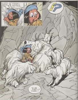 remarques: | Corbeau hardi le sioux s'est fait prendre son taliman par un aigle pour ne pas avoir respecté un avertissement et sans son talisman qui le protège, Corbeau hardi est désemparé Yakari se met à la recherche de l'aigle qui n'est pas son protecteur Grand Aigle >> p. 11 de petits tipis >> p. 17 l'ascension du pierrier avec les marmottes qui se dorent au soleil >> p. 22 le combat des mouflons dans sa quête, Yakari se fait aider par les chèvres de montagne, notamment par le mâle Corne racorni et il est nourri par Pis-pas-Piteux, la chèvre qui donne du bon lait et Yakari réussira à retrouver le talisman grâce surtout à son protecteur, le Grand Aigle >> un assez bon récit, Derib n'aime pas seulement les chevaux mais aussi les marmottes familiers de ses montagnes dont Derib réussit à faire de jolis paysages |