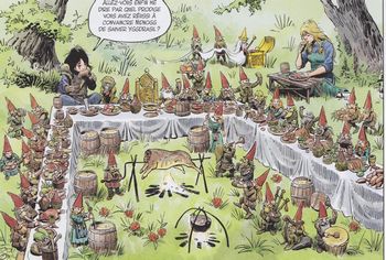 remarques: | dernier album de la série et il n'y aura pas de suite jusqu'en 2025 réapparition de Lundgen défiguré qui demande à Aaricia de l'achever avec le cristal de Fenrir afin qu'il ait une mort honorable quant à Louve et Tjahzi, ils arrivent à rejoindre le serpent Nidhogg mais celui-ci ne veut absolument pas les aider, car il veut se venger d'Odin qui l'a envoyé pour 1000 ans dans l'entre-deux mondes d'un autre côté, Vigrid, repenti, veut regagner la faveur des dieux et part solliciter l'aide des alfes de lumière pour empêcher les alfes noirs de détruire Yggdrasil alors que Lolth, la reine des alfes noirs a réussi à convaincre le dieu Azzalepstön de lui fournir le moyen de détruire les racines d'Yggdrasil en travaillant avec des haches fabriqués avec le métal qui n'existe pas >> p. 9 la légende de l'origine des neufs mondes et de la création du monde de Swartalflheim (voir l'album 6 de Louve pour le détail des neufs mondes) les alfes de lumière ne peuvent intervenir directement mais promettent à Vigrid de l'aider et ce sera Vigrid, transformé en serpent Nidhogg, qui refoulera les alfes noirs et prendra la place du serpent Nidjogg dans les racines de l'arbre Yggdrasil, mais il devra y rester 1000 ans, jusqu'à ce que le temps de la punition du vrai Nidhogg soit effacé, il sera toutefois dans sa tâche soutenu par Aaricia qu'il a toujours aimé alors que Louve et les nains fêtent leur victoire par un festin à la mode Astérix et Obélix >> un album qui ne termine pas la série en grande beauté, mais le scénario, tout en étant abracadabrant (ressemblant aux contes de Perrault et qui s'inspire quelque peu du seigneur des anneaux) reste toutefois amusant et fidèle à cette série d'heroïc-fantasy tout en mentionnant de nombreux commentaires relatifs à la mythologie nordique avec au finale un amour dramatique mais sans Thorgal annexes - couverture de l'album - le festin des nains - portrait de Louve |