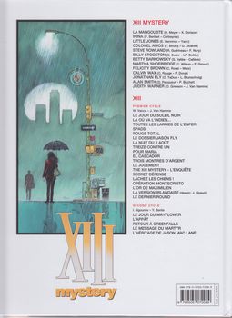 remarques: | Jessica, Jessie pour les intimes, sortie d'on ne sait d'où va retrouver à Santa Barbara la fameuse Judith Warner de Greenfalls >> p. 10 pub Dargaud pour l'album XIII 19 l'enquête il y eu encore un dernier album dans cette série intitulé - traquenards et sentiments (2024) (non collectionné ici) mais Jessica est recherchée par le journaliste Finkelstein et par le FBI sur ordre du président qui veut éliminer tous les témoins dangereux pour lui s'en suit des mésaventures avec la police et par des malfrats du coin >> p. 21-24 le hold-up sanglant dans la "homeopathic pharmacy" >> p. 33 référence au colonel Amos pour Jessica d'origine israëlienne, Jessica veut dire Isqah en hébreu (>> voir l'album XIII mystery colonel Amos) finalement, après des aventures abracadabrantes, Jessica et Judith deviendront amoureuses l'une de l'autre et partiront en Israël pour une vie meilleure après que Finkelstein ait renoncé (ou pardonné) à venger le meurtre de son ami Warren Glass qui fut la première victime de Jessica dans un avion >> ce treizième album se révèle un pauvre album tant pour le graphisme que pour le scénario et le texte, Van Hamme était vraiment fatigué, mais ce scénario est-il vraiment de lui? puisque Van Hamme meurt en mai 2018 et que l'album parait en octobre 2018 annexes - couverture de l'album - 4ème plat avec tous les titres des cycles de XIII sauf l'enquête, deuxième partie qui ne sera publié qu'en novembre 2018 Information une enième course-poursuite rocambolesque sans grand intéret pour l'histoire, aucune nouvelle question n'est soulevée, on n'y aprend strictement rien, chacun ayant vu le titre se serait attendu à retrouver un episode de la jeunesse de Judith à Greenfalls, ce n'est malheureusement pas le cas, au lieu de cela, on a droit a un espèce de Thelma et Louise improbable entre Judith et Jessica Martin, franchement décu de Jean Van Hamme qui nous sort ici un scénario qui ne fait qu'assouvir son fantasme de voir deux des ses plus belles heroines dans des ébats torrides |