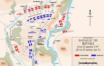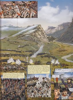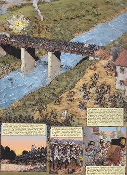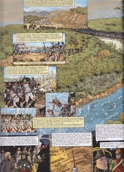 remarques: | changement de maison d'édition pour ce tome 4 paru 5 ans après le tome 3 Prairial an IV (mai 1796) - suite aux victoires de Bonaparte, le Directoire se méfie maintenant de ce général qui ne se conforme plus toujours à leurs directives, mais qu'il n'ose pas trop réprimander suite à sa popularité dans la population >> p. 4 les infidélités de Joséphine après avoir réprimé les révoltes de certaines villes lombardes, Bonaparte prépare la continuation de son offensive contre les troupes autrichiennes de Beaulieu établies le long de la rivière Mincia avec Mantoue comme base de réserve, >> p. 8 nouvelle victoire de Bonaparte à Villafranca après avoir franchi le pont de Borghetto pour éviter une rentrée de Bonaparte à Paris, le Directoire envoie Joséphine retrouver son amant en Italie et en attendant son arrivée, Bonaparte poursuit son prochain but: occuper Verone et soumettre la république de Venise, puis Bonaparte s'occupe des états pontificaux en occupant Bologne et Ferrare, toutes deux propriétés de la papauté nouvelle victoire sur les autrichiens de Würmser à Roveredo et Bassano, en deux mois, Bonaparte avait chassé les autrichiens du nord de l'Italie, récupéré des fonds importants pour la France et était devenu un héros national et maintenant, pour avoir les mains libres en Italie, Bonaparte oblige la papauté à accepter de dures conditions nouvelle offensive autrichienne menée par le maréchal Alvinczy avec la fameuse bataille du pont d'Arcole où Bonaparte faillit être tué, mais sera sauvé par le sacrifice de son brave aide-de-camp Muiron, puis, par des manoeuvres rapides, la divison Masséna surprend les arrières autrichienne qui subissent une défaite totale (novembre 1796) >> p. 26 la rapidité d'action est le meilleur allié de Bonaparte >> p. 30/31 la bataille du pont d'Arcole >> et p. 36/37 victoire à Rivoli n.b. Bonaparte fait souvent usage de l'artillerie, sa spécialité, pour disperser l'ennemi une dernière fois, l'Autriche envoie une nouvelle armée de 80'000 hommes, dirigée cette fois par l'archiduc Charles, un adversaire redoutable, qui veut rejoindre les troupes de Würmser, toujours assiégées dans Mantoue mais en mars 1797, l'archiduc Charles est battu en plaine de Piave sur les rives de l'Isonzo et du Tagliamento cette fois, les autrichiens sont obligés d'entamer des négotiations, ce seront les préliminaires de Loeben et la paix de Campoformio, l'Autriche doit céder les Pays-Bas et toute la rive gauche du Rhin, en outre l'Autriche reconnait la république Cisalpine de Lombardie, reçoit en compensation les territoires de la Vénétie; la république de Venise cesse d'exister, Bonaparte est au faîte de sa gloire n.b. en France, coup d'état du 18 Fructidor An V (4.9.1797) par Bonaparte pour rétablir le Directoire mis en difficultées par des élections de royalistes - prochain album annoncé: Orient mythique qui ne sera jamais publié suite au décès d'Osi en 2021 >> à nouveau un album très intéressant sur les campagnes d'Italie, scénario bien expliqué et très descriptif avec un graphisme respectable annexes - couverture de l'album - bataille du pont d'Arcole - bataille du mont Rivoli - carte de la bataille de Rivoli n.b. détails de la bataille de Rivoli: le général autrichien Provera chargé de délivrer Würmser à Mantoue échouera et les assauts par Lusignan (à gauche) et Quadsanovitch (à droite) sur les flancs des forces françaises à Rivoli seront repoussées, Bonaparte ayant déjoué leurs intentions, chance ou génie? Information 1/ Jean-Baptiste Muiron, né le 10 janvier 1774, mort le 15 novembre 1796 à Arcole, était l'un des aides de camp du général Bonaparte chef de bataillon à vingt ans, colonel l’année suivante, il partage la bonne fortune de Bonaparte, il est à ses côtés le 13 vendémiaire, commandant d'une batterie de quatre canons, il le suit également durant la campagne d’Italie et devient l'un de ses aides de camp, le 15 novembre 1796, sur le pont d’Arcole, alors qu’il charge à la tête de ses troupes, Bonaparte est mis en joue par un Autrichien, Muiron s’en aperçoit et se jette devant Bonaparte pour le protéger de son corps, la balle que reçoit le colonel Muiron lui est fatale Bonaparte ne l’oubliera jamais, devenu premier consul, puis empereur, Napoléon prend la famille de Muiron sous son aile afin qu'elle ne manque de rien, il fait rayer, en intervenant auprès du Directoire, certains membres de la famille de la liste des émigrés et, des années plus tard, nomme le père de Muiron comte d'Empire, il fait également baptiser une frégate du nom de Muiron, c'est sur cette frégate qu'il rentre d'Égypte quelques semaines avant son coup d'État du 18 brumaire, de plus, il mentionne Muiron dans son testament, léguant une somme substantielle à sa famille après la bataille de Waterloo, "colonel Muiron" est l'un des pseudonymes utilisés par Napoléon dans sa tentative d'échapper aux Anglais 2/ Jean-Andoche Junot, duc d’Abrantès1, dit "la Tempête" (1771-1813), issu d'une famille de petite bourgeoisie, le père de Jean-Andoche Junot est fermier du comte de Buffon, à Montbard, il entreprenait des études de droit à Dijon quand commence la Révolution française, il s’engage dans l’armée de 1791, dans le bataillon des volontaires de la Côte-d'Or, il est grièvement blessé d'un coup de sabre à la tête au combat de La Glisuelle, près de Maubeuge, devenu rapidement sergent de grenadiers, il participe au siège de Toulon en 1793, il y rencontre alors Napoléon Bonaparte et devient son secrétaire progressivement Napoléon se détache de Junot, trop téméraire à son goût (et qui a demandé en mariage Paula, soeur de Bonaparte, ce qui n'a pas été du goût de Bonaparte) il épousera une merveilleuse, Laure Permon, au début du Consulat, le 13 vendémiaire, lors de la campagne d’Italie, Junot se distingue par sa bravoure: il est réco