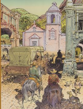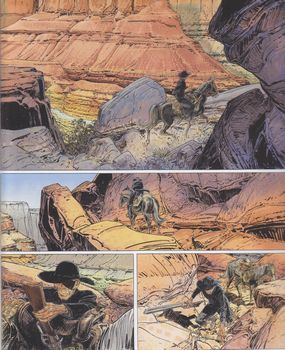 remarques: | la suite des aventures de Bouncer est reprise uniquement par Boucq, Jodorowsky, âgé maintenant de 89 ans, a abandonné la série Alexandre Boucq né en 1987 et Alejandro Jodorowky né en 1924 n.b. les deux premières planches sont vraiment d'apparence (l'esprit plus fort que le physique) la petite Panchita a été enlevée par le bandit El Cuchillo parce qu'elle possède tatouée sur son crâne, la carte de l'endroit où a été caché l'or maudit dérobé par son père, El Lobo >> p. 9 le clock maker: le suisse Martin Zeiss >> p. 33 les deux croque-morts, les frères Tapette, qui attendent leur future clientèle Bouncer avec son fidèle nain Job se met sur la trace du ravisseur qui se dirige vers le désert de Sonora au Mexique n.b. le chien manchot Mocho n'est plus de la parti, il est resté chef d'une meute de loups, toutefois, Bouncer et Job sont suivis par un groupe de légionnaires français sous la direction du capitaine Ledrillant, lui aussi à la recherche de l'or maudit >> p. 37 le journaliste Blabbermouth qui fournit des informations contre un dollar et la femme monstrueuse exhibée par El Cuchillo, une vicomtesse de Prusse, qui fait partie de la bande de El Cuchillo >>p. 48 mais pouquoi mettre en scène une grosse vache de comtesse? - el lobo = le loup - el cuchillo = le couteau entretemps El Cuchillo a rejoint une bande de desperados conduit par Cabron, mais le groupe de Bouncer tombe déjà dans un premier traquenard organisé par le skull, rescapé du pénitencier de Deep End et qui s'est mis maintenant au service d'El Cuchillo, par la suite Bouncer et son groupe seront attaqués par des guerriers apaches, mais sauvés grâce à un troupeau de bisons (des bisons fûtés) >> p. 71 il y aurait deux guides de la bande d'El Lobo: celui avec les soldats de Ledrillant et celui avec la bande d'El Cuchillo arrivés au Mexique, le groupe de Bouncer est arrêté par l'armée mexicaine >> p. 78 le jeu de la vérité >> p. 79 la mère d'El Cuchillo qui désire la tête de son fils maudit pour être sûr qu'il soit bien mort et >> p. 80 la chinoise Yen-Li, amoureuse de Bouncer, qui part à son tour à la rescousse avec les deux croque-morts et avec Zeiss, l'horloger suisse >> une belle brochette de personnages de toute sorte, une équipée sauvage menée par Bouncer, un assez bon scénario de Boucq qui n'a toutefois pas la touche sado-masochiste de Jodorowsky et toujours un bon graphisme bien qu'un peu moins élaboré annexes - couverture Ier et 4ème plat (le 4ème plat reste le même pour le prochain et dernier album) - extraits de page |