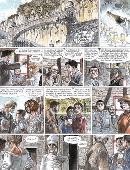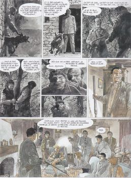 remarques: | un des premiers albums concoctés entre Hermann et Van Hamme avec préface de Van Hamme et galerie de portraits des antagonistes dans les pages de garde drame d'une nuit en huit-clos entre 29 personnages et un chien lors d'une noce dans l'hostellerie "la ferme du gaucher" (sans aucune étoile) à la suite d'une altercation entre l'hôte et le propriétaire concernant un hors-d'oeuvre aux crevettes avarié, la mariée est prise en otage par le restaurateur contre le payement du repas de mariage Jean Maillard, père du marié, met l'hôtel en état de siège alors que le restaurateur se retranche dans son hostellerie >> p. 19 le début des hostilités >> p. 39 le conseil de guerre familial à minuit par clair de lune, la bagarre se déclanche pour libérer les deux femmes (la mariée et l'épouse de Jean Maillard), ce sera un bain de sang et tout le monde commence à tirer sur tout le monde, sans grande distinction >> c'est un peu une page western dans les temps modernes où tout finit par une hécatombe, avec des planches teintées de sang, si le graphisme de Hermann reste de bonne qualité, le scénario de Van Hamme n'est cette fois pas des plus recherché, un enclanchement d'actes irrationnels par 29 personnes impliquées dans une bagarre sans grand intérêt Information l'irrémédiable bêtise humaine, ils se marient, ce devait être le plus beau jour de leur vie, mais voilà qu'intervient une innocente tomate farcie aux crevettes, hélas, la farce n'amusera personne car, soudain, dans un véritable maelström de cris, de coups de feu, de larmes et de sang, la lune de miel tourne en lune de guerre, la haine tue l'amour, la mort fauche aveuglément, et l'on se dit, une fois de plus, que si l'homme n'était pas accroché comme une ventouse à son irrémédiable bêtise, tout irait beaucoup mieux sur la planète |