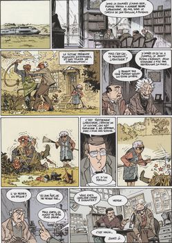 remarques: | la suite du premier tome, réédition de 2014 Sophie a hérité du vieux Garan-Servier d'un compte bancaire aux Bahamas crédité de 99 millions d'Euros, elle envoie à Pierrot un colis contenant 100'000 Euros et signé Ann Bonny sans savoir que cette signature désignait le surnom du vieil amour de Pierrot: Anita celui-ci se met à la recherche d'Anita et ce sera la trame principale de l'album >> p. 9 la réunion des vieux fourneaux pour une manifestation au Elektrobuzz et lors d'une réunion de hauts personnages (un attentat gériatrique) >> p. 12 l'AAA = archipel anarchiste autonome = l'île de la Tordue des vieux fourneaux, fondé par la vieille baronne anarchiste: Francine de la Rochebonnefoy dite Fanfan la chaudière >> p. 15 la tactique du viajeune (le contraire du viager) = héberger des jeunes activistes fauchés pour leur donner les moyens de faire chier le système dans de bonnes conditions >> p. 35 l'attentat gériatrique au moutardier >> p. 52 l'histoire de l'archipel de Nauru, de ses habitants, de son phosphate, de la croissance non-contrôlée, de la pollution, c'est une critique acerbe de notre soi-disante civilisation >>> deuxième volet des vieux fourneaux, toujours acceptable mais moins bon que le premier tome, à nouveau une critique de la société moderne, avec quelques bons vieux jeux de mots en y joignant de l'humour avec les pains vendus en boulangerie parisienne (les baguettes: la Sarmentine, la Fleurimeuline du pape, la Grand Siècle, la Câlinette = gamme de produits "terroir" inventé par le cartell du pain pour augmenter les ventes et produire un succès "croissant" dans les boulangeries) n.b. il y aura bien sûr une suite à ce jour de quatre volumes (non collectionnés ici): - tome 3 celui qui part (2015) - tome 4 la magicienne (2017) - tome 5 bons pour l'asile (2018) - tome 6 l'oreille bouchée (2020) Information - en 2018 tournage d'un film les vieux fourneaux avec Pierre Richard, Eddy Mitchell, Roland Giraud et Alice Pol dans le rôle de Sophie - un deuxième épisode est prévu pour 2022 |