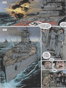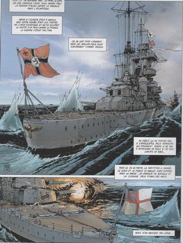 remarques: | 11ème volume de la série, graphisme et scénario Jean-Yves Delitte avec une superbe couverture d'album mai 1941, le Bismarck, un cuirassé dernier-né allemand et le Prinz Eugen, un croiseur lourd, se trouvent en chasse près des côtes de l'Islande avec comme mission d'attaquer et de couler les convois alliés dans l'Atlantique le Bismarck possède 8 canons de 380 mm répartis dans quatre tourelles nommées Anton, Bruno, Caesar et Dora le 24 mai, combat naval avec le Hood, croiseur de combat et le Prince of Wales, cuirassé tout récent, dès les premiers engagements, le Hood est touché et coulé, le Prince of Wales sévèrement endommagé rompt le combat Churchill est atterré, mais veut maintenant à tout prix la peau du Bismarck légèrement endommagé (à son radar et avec une fuite de mazout), le Bismarck fait route au sud vers les côtes françaises et se détache du Prinz Eugen qui continue sa route (par un itinéraire différent, il atteindra le port de Brest) le Bismarck est repéré par un avion de reconnaissance qui déclanche une attaque par les avions-torpilleurs du porte-avions Victorious, mais ce ne sont que des Fairey Swordfish démodés qui ne causeront aucun dommage au Bismarck puis le Bismarck disparaît au radar des navires anglais qui le suivaient (les croiseurs Norfolk et Suffolk), il est repéré à nouveau par un avion de reconnaissance et cette fois une nouvelle attaque d'avions-torpilleurs, cette fois du porte-avions Ark Royal endommagent fortement le gouvernail du Bismarck qui reste irréparable en mer, le Bismarck doit ralentir sa marche et tourne en rond, de plus avec son radar hors d'état de marche, le cuirassé est devenu pratiquement aveugle et ne peut répliquer aux destroyers qui le harcèlent le 27.5. à 8.47 heures, c'est l'hallali par la force anglaise arrivée sur place en grand nombre (environ 30 bâtiments) dont le navire-amiral King George V qui tire le premier, suivi du Rodney et autres cuirassés ou croiseurs de combat, un implacable compte à rebours est alors enclanché à 9.30 heures en moins de 40 minutes, le Bismarck est devenu une épave que les navires anglais achèvent à la torpille, le Bismarck coule à 10.30 heures en fin d'album, dossier historique de 8 pages par Delitte >> le drame du Bismarck vu et raconté par les deux matelots allemands fictifs: Adolf et Ludo, le scénario n'est pas très recherché, mais le graphisme de Delitte est à nouveau sublime et compense largement un scénario quelque peu faible Information à la fin de la première guerre mondiale, la marine allemande s'est vue fixer des limitations importantes, c'est la marine anglaise qui maîtrise les mers avec ses cuirassés géants appelés superdreadnoughts et d'imposants croiseurs de bataille armés en partie avec 8 pièces d'artillerie de 401 mm, chaque canon pesant près de 100 tonnes et tirant à 35 km de distance des obus d'une tonne se déplaçant avec 800m/seconde Hitler ne respecte pas les accords du traité de Versailles et réarme tous azimuts dont le lancement du Bismarck le 14.2.1939 après le lancement des cuirassés de poche Deutschland, Admiral Scheer, Admiral Graf Spee ainsi que les croiseurs de bataille Scharnhorst et Gneisenau le Bismarck et son frère jumeau, le Tirpitz, mesurent 250 m de long, jauge 51'000 tonneaux et possède 8 pièces de 380 mm, 12 pièces de 150 mm et une pléthore de canons anti-aériens après la défaite de la France, l'Allemagne veut affaiblir la Grande-Bretagne avant de l'envahir en attaquant (surtout avec les U-Boote) ses convois d'approvisionnement le plan Rheinübung prévoyait d'envoyer la flotte allemande attaquer les convois, mais la Kriegsmarine n'est pas entièrement prête et seul le Bismarck avec le Prinz Eugen prennent la mer en 1941 depuis la Norvège, mais les deux bâtiments sont déjà repérés par la R.A.F. tirer au canon n'est plus un art mais une science, on calcule les tirs des obus (800 m/seconde) avec des télémètres et autres instruments optiques de précision et grâce surtout au radar (radio detection and ranging) mais ce sera lentement la fin des grands cuirassés (tel le Bismarck) terriblement exposés aux attaques aériennes lancées par porte-avions interposés, à partir de 1990, il n'existe plus de grands cuirassés dans les marines mondiales |