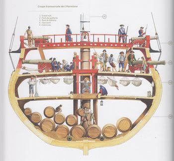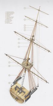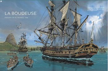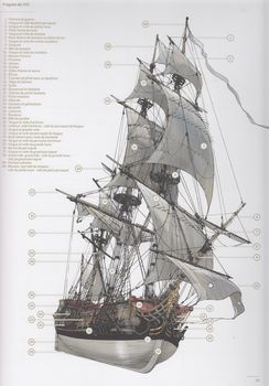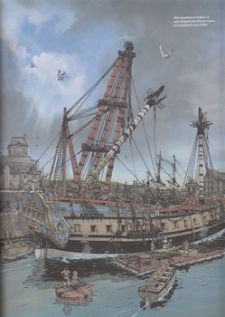 remarques: | cet ouvrage est une invitation à appareiller à bord d'une dizaine de frégates (à voile), elles ont été sélectionnées pour leurs hauts faits d'armes, les grandes découvertes qu'elles ont permises ou l'avancée technologique qu'elles ont pu représenter rapides et facilement manoeuvrables, elles avaient diverses fonctions: partir en reconnaissance, porter des nouvelles, surveiller les côtes, nuire au commerce de l'ennemi n.b. au contraire des vaisseaux de ligne, elles ne participaient généralement pas aux grandes batailles navales première partie: description et histoire des frégates 1/ description - la frégate a donné son nom à l'oiseau qui vole le plus rapidement et le plus constamment sur les mers, - traditionnellement, les frégates, comme les corvettes, sont désignées en français par un nom féminin - navire polyvalant, le terme frégate est repris dans plusieurs ouvrages consacrés à la marine, notamment dans l'un des premiers ouvrages traités sur "l'art de la navigation" de Pedro de Medina publié en 1545 - dès 1830, les frégates deviennent cuirassées en fer à la place du bois et seront appelées croiseurs la vue en éclaté d'une frégate présente les étages suivants: a) pont des gaillards avec la mâture, c'est à ce niveau que l'on manoeuvre le navire b) pont de batterie, ouvert sur chaque flanc d'autant de sabords qu'il peut y avoir de canons, c'est ici que se regroupe la puissance de feu c) faux-pont ou entrepont, c'est le lieu de vie de l'équipage d) les cales (et ligne de flottaison) où sont entreposées les réserves (vivres et munitions) - les quatre mâts principaux d'une frégate: a) mât d'artimon (c'est le plus petit des mâts situé à l'arrière d'un voilier, mizzenmast) b) grand mât (mât principal, central, le plus haut d'un voilier, mainmast) n.b. ce grand mât pouvait atteindre une hauteur jusqu'à 100 m c) mât de misaine (mât situé à l'avant d'un voilier, foremast) d) mât de beaupré (il se trouve à la proue d'un navire, fortement incliné vers l'avant, il est anciennement appelé dolon ou bowsprit en anglais) - ce n'est qu'une fois mis à l'eau que le navire reçoit son gréément, les mâts d'abord, chacun étant constitué de trois éléments: les bas-mâts, les mâts de hune et les mâts de perroquet - les figures de proue étaient de véritables oeuvres d'art - grand cabestan = treuil à axe vertical utilisé pour virer l'ancre ou des cordages >> p. 12 le développement des canons propres à l'armement des frégates 2/ sur les chantiers navals (arsenaux) - dès 1671 en France, Colbert est le premier à définir un cadre pour l'art de la construction navale, tous les corps de métier y sont représentés - le bois (surtout de chêne) reste l'approvisionnement prioritaire - corderie et voilerie utilisent essentiellement le chanvre (11'000 m2 de voile et 10 km de cordage) - les vergues = longue pièces de bois disposée en croix sur l'avant des mâts pour soutenir une voile, les vergues nécessitaient 5 km de cordage + 7 km pour les voiles - en général, il y a sur les vaisseaux 24 voiles perpendiculaires à la quille et 10 voiles disposées dans l'axe >> p. 20 l'outillage - construction par montage et assemblage des pièces d'un navire - il fallait environ une année pour qu'un nouveau vaisseau soit prêt à appareiller - une frégatte pouvait filer dans les 12 nœuds, vitesse remarquable pour l'époque >> p. 18/19 la corderie royale >> p. 22/23 le montage de la quille (étrave) >> p. 24/25 coupe verticale du grand mât >> p. 27 machine à mâter et frégate en cours d'armement >> p. 29 une frégate de VIII (canons de 8 livres) 3/ la vie à bord d'une frégate - une frégate est aux ordres d'un capitaine et de son second - l'équipage se monte selon le type de frégate de 250 à 500 hommes composé de pilotes, timoniers, gabiers, matelots multitâches et de de surnuméraires tels que cuisinier, chirurgien, etc ainsi que de canonniers (9 hommes par canon), c'est un village en autarcie >> p. 31 afin que la frégate soit en permanence opérationnelle, l'équipage est divisé entre deux parties égales: le quart de tribord et le quart de bâbord >> p. 32 ce sont les cloches montées sur les gaillards qui rythment les journées >> p. 32 à cette époque, les méthodes de conservation sont sommaires et la variété des menus limitée - p. 33 les conditions sanitaires et de sécurité à bord déplorables causent plus de dommages que les combats - la mort fait partie du voyage et au meilleur des cas, on ne constate que 5% de mortalité >> p. 36 le maniement des canons sur une frégate de XII (9 hommes par canon): le branle-bas, le chargement, la mise en batterie, l'amorçage, le pointage et l'ordre de donner le feu deuxième partie: description de frégates bien connues la dénomination frégate de XII ou de IX veut dire que celle-ci porte des canons de 12 livres ou de 9 livres 1/ l'Alcyon, frégate-vaisseau, France, 1689 - en 1643, deux puissances se disputaient le leadership sur les mers: l'Angleterre et la jeune république hollandaise des Provinces-Unies - dès 1661, Louis XIV prend la décision de doter enfin son royaume d'une réelle marine, ce sera la Royale - dès sa sortie, l'Alcyon est commandée par le célèbre Jean Bart, corsaire, devenu officier de la Royale - il engage avec l'amiral Tourville le 10.7.1690 la bataille du cap Béveziers (ou Beachy Head pour les anglais) sur la côte anglaise à l'est de la falaise des Seven Sisters, victoire de 75 vaisseaux français sur 57 de la flotte anglo-hollandaise - après plusieurs batailles, l'Alcyon connait une fin paisible en 1717 à Brest où elle est désarmée 2/ le Shtandart, frégate légère, Russie, 1703 - un des tous premiers bâtiments en 1703 de la nouvelle marine du tsar Pierre Ier après que celui-ci ait visité les chantiers navals d'Amsterdam et de Londres - la frégate et ses 120 membres d'équipage participa aux combats pour la défense de Sain