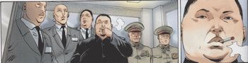 remarques: | dernier album de la série - en Corée du Nord, le général Hong Tong-Jo a été démasqué et l'équipe de Nomane avec Karen et la CIA doit se replier, une chasse à l'homme est ordonnée par le guide suprême Cho Ihn Kyang, mais sans résultat >> p. 12 la formule de l'antidote au lacrima christi - à Rome, la tueuse à la chevelure rousse, la compagne de Bencivenni est abattue après une course échevelée >> p. 36 l'arc de triomphe de Pyongyang >> p. 42 Mattei, le grand génie qui enregistre tout mieux qu'un ordinateur, qui mentionne en passant le mystérieux visiteur de Montespan, soit le franc-maçonniste Hertz dont on se demande pourquoi il rend une visite aussi courte à Montespan (pour parler de Satan!) et qui n'a plus grand chose à faire dans cette dernière série, sauf de meubler curieusement le scénario ou le graphisme et la dernière phase de l'opération sera de détruire le laboratoire du guide suprême où se synthétise le lacrima christi >> toutefois, ce dernier album est un véritable flop, une conclusion des plus brèves sans aucun suspense, on détruit la souche du lacrima christi dans le laboratoire avec le rectificateur déguisé en un résistant nord-coréen, cousin d'un assistant du laboratoire qui fera entrer le rectificateur sans problème dans ce saint des saints et dans l'explosion du laboratoire, le guide suprême sera aussi supprimé, mais ce n'était que le sosie du véritable guide qui, lui, n'a pas fini de semer la pagaille dans le monde, même sans le lacrima christi, toutefois en page 55, ce tyran montre une certaine estime pour son sosie, qui s'est sacrifié pour lui, en voulant bien dédommager sa famille et il est fort probable que cette fois l'excellente série du triangle secret aura trouvé une fin définitive mentionnant une similitude étonnante avec l'épidémie du covid 19 en 2020 facit pour ce dernier album: beaucoup de bruit pour rien, much ado for nothing (Shakespeare) |