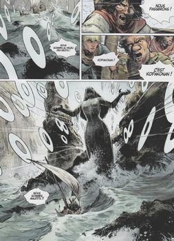 remarques: | un épisode complet dans la série Thorgal - Louve a été enlevée par Grimur, un viking islandais et a été enfermée dans une cage, elle est destinée à être l'épouse du fils de Grimur - Thorgal part à sa recherche avec Jolan vers les îles Feroe (= les îles féroces) >> p. 16 sur son chemin maritime, Thorgal est confronté avec Kopakonan, la selkie qui est l'effigie en bronze d'une phoque femelle >> p. 28 la légende de Selkie qui a jeté un sort aux vikings islandais, pour se venger, ceux-ci effectue le grindadrap, un massacre sanglant de phoques pour essayer de faire disparaître la malédiction de Selkie - finalement, Thorgal et Jolan réussiront à délivrer Louve et retourner à leur village, en emportant les deux orphelins de Grimur qui a perdu la vie dans l'aventure >> un récit basé probablement sur une ancienne légende viking, le graphisme de Vignaux est assez bien vignolé, mais moins élaboré que dans les aventures antérieures de Thorgal, alors que le scénario de Yann reste dans la lignée des aventures de Thorgal |
