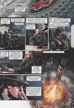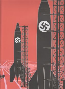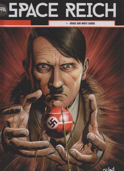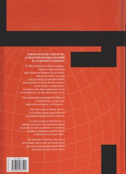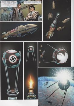remarques: | Space Reich est une série affiliée à la série Wunderwaffen, ce tome 4 est le seul exemplaire collectionné ici (à titre d'exemplaire représentatif de la série), une autre série affiliée à Wunderwaffen est Zeppelin's War, qui se réfère à la première guerre mondiale, mais également non collectionnée ici les nazis à la conquête de l'espace - après avoir écrasé l'URSS fin 1943, le Reich étend désormais son emprise de l'Atlantique à Vladivostok - en 1945, en dépit de son retard technologique, l'Amérique, resté isolationniste après l'invasion de l'Angleterre en 1940, défie soudain Hitler en annonçant l'envoi prochain d'une fusée dans l'espace - mais façe à l'Amérique va se dresser Werner von Braun dont les missiles ont écrasé Moscou, Von Braun qui rêve depuis longtemps du cosmos et d'installer un jour une base allemande sur la lune - dans le duel spatial qui s'engage entre l'aigle nazi et l'aigle américain, tous les coups, même les plus surprenants vont être permis - 1949, ayant survécu à l'attentat contre lui, un Von Braun complètement changé reprend fermement son programme spatial après des mois d'arrêt - au même moment, les USA tentent un vol balistique risqué avec un chat quelque peu étrange pour étudier les réactions cérébrales d'un mammifère supérieur en apesanteur, le premier vrai pas en direction d'un vol humain habité - de l'autre côté de l'Atlantique, Hitler, dévoré par la maladie, puise dans ses dernières forces pour voir s'envoler le premier satellite artificiel aux couleurs du Reich avant de mourir >> p. 3 von Braun en chaise roulante (il a échappé à un attentat) accompagné de son médecin, le dr. Mengele, au centre spatial de la base du Reich en Bretagne, France occupée >> p. 9 et son équivalent, le centre Goddard Rocket Test Range à White Sands, Nouveau Mexique où travaille aussi Jacques Bergier (envoyé par De Gaulle) qui s'occupe d'un chat qui doit être lancé dans l'espace lors de la prochaine expédition spatiale habitée >> p. 23 vive la France libre et vive le Québec (mais pas vive le Québec libre cette fois) >>p. 32 le cerveau du chat est parfaitement connu des neurophysiologistes de par ses capacités physiques et psychologiques >> p. 43 et le 20.7.1949 le premier satellite est lancé par une fusée du IIIème Reich, mais au même moment, Hitler est terrassé par sa maladie, Himmler va-t-il devenir le prochain Führer? >> une deuxième série uchronique sur le développement de la seconde guerre mondiale, cette fois à la conquête de l'espace où les nazis ont pris une certaine avance sur les américains, mais rien de très particulier pour la trame du récit et le graphisme de Nikolic est acceptable tout en ne pouvant égaler celui de Maza dans la série Wunderwaffen, toutefois une couverture d'album assez bien réussie |