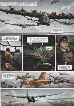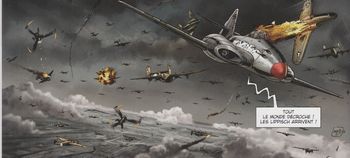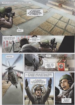 remarques: | - fin décembre 1946, frontière Antarctique sud de la Nouvelle Souabe allemande - l'avion de reconnaissance de la base SS vient de répérer l'endroit où un météorite d'un million de tonnes situé mille mètres sous la glace se serait écrasé il y a 10'000 années >> p. 6 sur le U-Boot cargo naviguant en surface, le medium SS Hansen de l'Ahnenerbe détecte un gros bombardier allié à 20 km avant d'être aperçu sur le radar >> p. 9 l'attaque aux grenades réglées pour exploser à 250 m de profondeur >> p. 10 à Berlin, présentation à Hitler de sa nouvelle prothèse de bras gauche munie sur l'ordre de Himmler d'un système pour influencer l'esprit du Führer >> p. 12 les quatre nouveaux cavaliers de l'apocalypse: Himmler, Goebbels, Goering et Speer, et c'est Himmler qui a mis Hitler dans sa poche, HHhH =Hitlers Hirn heisst Himmler (le cerveau de Hitler s'appelle Himmler) >> p. 14 Frau Riefenstahl, la photographe attitrée dans un hélicoptère à un seul rotor >> p. 16 la présentation au peuple allemand de la croix gammé dans le ciel, une figure effectuée par les nouveaux chasseurs Focke-Wulf >> p. 24 les trois héros de la Luftwaffe: Rudel, Hanna Reitsch et le Standartenführer Murnau, le héros de la série >> p. 25 les trois grands ennemis d'Hitler: Churchill, De Gaulle et Truman qui préparent maintenant une offensive contre la base antarctique SS n.b. Churchill n'a pas l'air de bien apprécier Truman >> p. 27 discussion sur Leni Riefenstahl qui aurait désapprouvé les camps d'extermination et à qui Himmler aurait assuré que ces camps n'existaient pas >> p. 28 le Sonderbüro 13 = les projets invisibles du Reich (dérivés de l'Ahnenerbe pour la recherche en autre de soldats perfectionnés) >> p. 30 au lieu de forage (zone d'impact du météorite), le médium Hansen devine que ce n'est pas un météorite >> p. 33 l'apparition de la tête d'Hitler dans le cerveau de Murnau et juste avant d'approcher sa mort, on dirait qu'est ancrée dans son cerveau la conviction que, pour une raison ou une autre, Murnau doit survivre dans un but particulier lié au Führer - Murnau rejoint le front italo/allemand à Rimini, les italiens sont des planches pourries sauf pour l'aviation selon un officier allemand >> p. 37 à 44 scènes de combats aériens avec tous les types d'appareils de la Luftwaffe >> p. 46 le porte-avion anglais Hurricane avec ses chasseurs à réaction sea vampire en route pour la base antarctique SS, contre la flotte de débarquement, la Luftwaffe SS veut faire intervenir les nouveaux appareils Triebflügel à décollage vertical - supplément: dossier de sept pages sur l'Ahnenerbe, archéologie mystérieuse et bureau nazi du paranormal (la chasse aux surhommes d'antan) par Jacques Bergier+ Pauwels, auteur du matin des magiciens >>> un récit toujours bien uchronique assez intéressant avec un graphisme tout à fait acceptable Information - la Nouvelle-Souabe (en allemand : Neuschwabenland) est une zone de l'Antarctique d'une superficie de 600 000 km2 revendiquée par l’Allemagne nazie et située sur la terre de la Reine-Maud, revendiquée par la Norvège, la Nouvelle-Souabe a été explorée par l'Allemagne au début de l'année 1939 et nommée d'après le navire de l'expédition, le Schwabenland, lui-même nommé d'après la région allemande de Souabe |