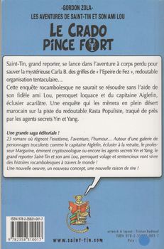 remarques: | - ceci n'est pas tout-à-fait une série pirate, mais plutôt une parodie des aventures de Tintin racontées sous la forme de romans humoristiques sans aucune illustration à part les couvertures, titre complet: les aventures de Sain-Tin et de son ami Lou il y eut 26 livres parus de 2008 à 2020 (voir info), ne sont collectionnés ici que 3 livres de cette série dont - le no 1 le crado pince fort (2008) - le no 13 objet qui fume (2011) n.b. celui-ci correspondant à objectif lune - le no 14 on a fait marché sur la lune (2011) ces récits sont du genre humoristique sans grande prétention, ils se réfèrent quelque peu aux aventures de Tintin en reprenant certains thèmes de base, mais au scénario comlètement différent, ces romans ont été principalement écrits par Gordon Zola avec en partie Bob Garcia a) Gordon Zola sous le nom de plume d'Érick Mogis, né en 1964, écrivain et éditeur français, il est le créateur des enquêtes calambourdesques du commissaire Guillaume Suitaume ainsi qu'une série de douze romans policiers humoristiques b) Bob Garcia, né Robert Garcia en 1954, est un auteur de romans policiers et d'essais sur la bande dessinée, ainsi que journaliste/chroniqueur littéraire sur plusieurs médias (TSF Jazz, Télessonnes, France) c) ainsi que deux autres auteurs: Pauline Bonnefoi et Hervé personnages des récits (ils parodient ceux des aventures de Tintin et Milou) - Saint-Tin, journaliste au Petit Vin qui Aime, il est le fils présumé du célèbre reporter, ce qui le complexe, car il est loin d'être aussi doué que lui - Lou, perroquet bavard et débauché venu du Guacamo, comme l'indique le titre, c'est l'ami de Saint-Tin - capitaine Ernest Aiglefin, éclusier à la retraite, en digne héritier de la famille des Haddockoff (des Russes blancs émigrés), c'est un alcoolique impénitent qui réside au vieux moulin appelé Moulin Tsar, le Spyritus est sa boisson favorite - Archibald Tringue, fidèle majordome du capitaine Aiglefin et aussi l'homme à tout faire - Orphéon Margarine, célèbre cryptozoologue qui vit aux crochets d'Aiglefin - agents Yin et Yang, deux agents secrets pas très discrets, d'origine thaïlandaise - Alba Flore, célèbre romancière belge, amie de Saint-Tin - Hippolyte Buro: VRP = représentant de commerce, acharné à vendre tout et n'importe quoi à Aiglefin qui le considère comme son pire ennemi - Rasta Populiste, un méchant, ennemi juré de Saint-Tin - docteur Molaire, un autre méchant petit résumé des 3 livres collectionnés a) le crado pince fort (premier récit, probablement le plus intéressant) >> p. 10 les origines de Saint-Tin - enquête sur le trafic de drogue >> p. 23 il faut détruire l'épeire de Fez au Maroc - Saint-Tin part au secours de Carla B. enlevée par des trafiquants, y sont mêlés des policiers japonais que l'on retrouve souvent assassinés - entrée en scène de Rasta populiste, chef des trafiquants >> p. 54 du homard pour Omar - sur la piste des ravisseurs de Carla, Saint-Tin est capturé dans le grand désert saharien, le pays de la soif - Saint-Tin arrive à s'en sortir et délivrance de Carla Boudjan, nippone-arménienne, agent pour l'empire japonais de Akihito avec son adjoint, l'agent Shung Honery, nom de code hiro hiro seth - finalement le homard Omar se fera pincer crado grâce à l'intervention du capitaine Aiglefin >> p. 101 les injures du capitaine dont AAAGHHHHH - dernière page, apparition du prof. Margarine qui annonce l'évasion de Rasta populiste >> probablement le premier et le meilleur livre de la série b) objectif qui fume - le groupe de Saint-Tin avec le prof Margarine rejoint en Salmanye le scientifique Bertax et la femme savante, le dr Emma Mouth - le but est d'organiser une expédition vers la lune pour y planter des graines particulières afin d'y développer une culture appropriée, ce sera l'opération Gargantua >> p. 72 à l'évidence, cette opération allait bouleverser l'avenir de l'agriculture et de l'alimentation mondiale bien que les pactes commerciaux entre les pays ne se signeraient sans doute pas dans le miel et d'ailleurs à qui appartiendrait la lune et à qui de droit reviendrait l'exploitation du sol lunaire? >> p. 102 le plan de la fusée K-Supok-6 - stupéfaction, les deux agents Ying et Yang se sont embarqués sur la fusée sans prévenir - mais un homme de main nain d'une nation concurrente s'est aussi introduit clandestinement dans la fusée >> p. 117 il passera sur une table d'opération où s'étalaient des dizaines d'outils de toute nature et de toute couleur, il y avait du contondant, du coupant, du découpant, du sciant, du tapant, de l'arrachant, du dissoudant, du dissolvant, du pendant, de l'écrasant, du bouchant, du débouchant, du pliant, du noyant, de l'étouffant, de l'asphyxiant, de l'empoisonnant, bref que du déroutant >> fin de la première partie (peu intéressante) c) on a fait un marché sur la lune - en route pour la lune, la composition finale de l'équipage >> p. 52 on découvre l'identité du clandestin, c'est la terrible espionne écossaise Feline O'Sent - rencontre avec l'astéroïde Apophis >> p. 74 l'alunissage se déroule parfaitement: alunok impec, l'installation de la base agricole est commencée >> p. 88 description du sol lunaire, mais le perroquet Lou ne peut pas voler sur la lune, ceci dû au manque d'air - découverte sur la lune de monstres à trois pattes (des sélénites?) qui pourraient dévaster les cultures - on en restera là pour le moment, car contrairement à l'album on a marché sur la lune, il n'y aura ici aucun retour vers la planète Terre >> un épisode lunaire un peu débile, sans grand intérêt note: une oeuvre d'un nouveau genre, exotisme, aventure et humour autour d'une galerie de personnages peut-être truculents, soit-disant terribles, qui vont vivre des histoires rocambolesques, un nouveau concept, une nouvelle raison de rire, mais un rire plutôt farineux annexes - couverture des trois l