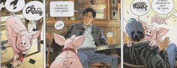 remarques: | - poursuite à l'homme dans un complexe cybernétique du sud de la France, les tueurs recherchent des documents secrets et après les avoir extorqués, la victime est éliminé par une surdose acoustique, mais on ne connaîtra pas dans ce premier tome l'identité du mystérieux commanditaire - en attendant de rejoindre son patron en Indonésie, Simon s'amuse avec un cochon dont la maîtresse ne veut pas jouer au cochon >> p. 8 le cochon Donald amoureux de Simon - avec Simon et Silky, Largo Winch s'attaque maintenant à une de ses société qui produit de l'étain pour fournir des composants essentiels aux smartphones et aux batteries pour voitures électriques, mais cette société exploite des enfants dans de mauvaises conditions, le tout dans un environnement de grande pollution Largo va y mettre de l'ordre et mettra les enfants à l'abri dans un de ses hôtels cinq étoiles >> p. 16 le milliardaire humaniste - concurrent du holding Winch, la société Manskind cherche à entrer en relation avec Largo Winch - entretemps on a droit à un défilé de mode durant lequel un mannequin essaiera sans succès d'abattre par vengeance le CEO de Manskind, Jarod Manskind >> p. 24 un défilé explosif avec une belle paire de fesses - finalement, Jarod Manskind et Largo Winch pourront se rencontrer et organiseront une expédition spatiale qui vers la fin de l'album risque de tourner en catastrophe, une rencontre qui sera le prélude à de gros ennuis, car dans l'ombre oeuvrent de mystérieux tueurs aux motivations incertaines, le monde de l'économie change, mais pas la façon qu'ont certains criminels de faire du business >>p. 42 explication sur le titre de l'album: la frontière de la nuit = la ligne de Karman = la ligne de démarcation entre l'atmosphère et l'espace, 100 kilomètres au-dessus de la terre >> si le graphisme de Francq reste respectable, le scénario de Giacometti n'est pas à la hauteur malgré le vol spatial dans la stratosphère, tout d'ailleurs n'est pas très clair dans ce premier tome, de plus la couverture n'est pas trop recherchée annexes - 1er plat et page de garde de l'album ** - Simon et son cochon - l'avion porteur de la navette qui ne manque pas de réacteurs - le vol spatial à haut risque ** où Mary Stricker, la tradeuse qui a aidé Largo Winch lors de ses recherches à la Silver Trading, est nommée à la tête de la division banque à la place de feu Rudi Gessner, le poste de dirigeant à la divison aéronautics restant toujours encore vacant >> voir l'album les voiles écarlates le prochain et dernier album de la série s'intitule le centile d'or (2023), non collectionné ici n.b. en statistique descriptive, un centile est chacune des 99 valeurs qui divisent les données triées en 100 parts égales, de sorte que chaque partie représente 1/100 de l'échantillon de population, le centile fait partie des quantiles |