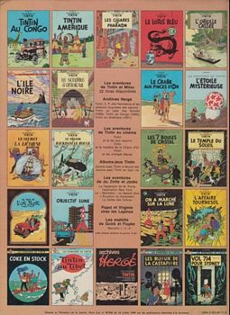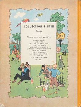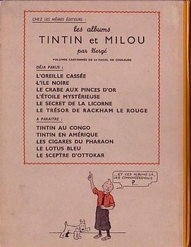 remarques: | - l'identification des albums Tintin n'est pas chose facile et les collectionneurs le confirmeront - d'abord une absence complète de signification du copyright, puis les titres sur les 4ème plats ne sont souvent pas mentionnés chronologiquement - à savoir parmi d'autres distinctions: 1/ le premier album couleur en 1942 est l'étoile mystérieuse, ce sera aussi le plus emblématique pour les critiques à Hergé 2/ dans les premières éditions couleur, il faut trouver six albums au "dos blanc" (4ème plat antérieur à 1945), soit - l'étoile mystérieuse - l'oreille cassée - l'île noire - le crabe aux pinces d'or - le secret de la licorne - le trésor de Rackham le Rouge - le dernier album en N&B fut le crabe aux pinces d'or (1941) et le dernier album N&B (1942) à être mis en couleur fut les cigares du pharaon en 1955 n.b. curieusement cet album des cigares du pharaon en N&B (A18) a été encore publié en 1942 avec une nouvelle couverture et quatre hors-textes couleur - le secret de la licorne et le trésor de Rackham le Rouge n'ont pas paru en albums mais uniquement en N&B comme strips dans Le Soir 3/ il y eut aussi des 4ème plats avec Haddock portant un pull deux couleurs, 10 albums généralement dans les éditions B1, soit - Tintin au Congo - Tintin en Amérique - le lotus bleu - l'oreille cassée - l'île noire - le crabe aux pinces d'or - le sceptre d'Ottokar - l'étoile mystérieuse - le secret de la licorne - le trésor de Rackham le Rouge - à partir de l'album les 7 boules de cristal (B2), les pulls Haddock deviennent de même couleur ainsi que l'album les cigares du pharaon qui ne parut comme album couleur (B14) qu'en l'année 1955 4/ les quatrième plats changeront complètement à partir des éditions C1 (1975) annexes - 4ème plat dos blanc de l'album trésor de Rackham le Rouge (A24 1945), 4ème plat pull deux couleurs (B1 1946) et 4ème plat C1 (1975) du même album |