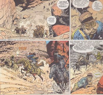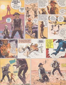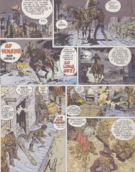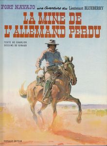 remarques: | début d'un court, mais extraordinaire cycle des aventures de Blueberry tant pour le scénario que pour le graphisme tome 11, 1972, dernier titre: la mine de l'allemand perdu en 1868, en Arizona, le lieutenant Blueberry, qui assure à titre provisoire les fonctions de marshall d'une petite ville frontière, traque dans le désert un escroc et un meurtrier Prosit Luckner, qui recherche une mine d'or légendaire, située au cœur des monts de la Superstition, la montagne sacrée des Apaches, il doit tout à la fois venir à la rescousse de son vieux complice, Jimmy MacClure, qui s'est laissé prendre aux rêves de richesse que lui a fait miroiter l'escroc et à barrer la route à deux tueurs sans scrupule attirés eux-aussi par la mine d'or ainsi qu'échapper aux pièges du désert comme aux attaques des guerriers apaches menés par Petite Lune relégué à Palomito, un bled perdu au sud de Fort Navajo par le général Allister alias Tête Jaune, Blueberry rencontre l'escroc tricheur Prosit Luckner >> p. 5 présentation de Luckner: Baron Werner Amadeus von Luckner, descendant d'une illustre famille prussienne, docteur en médecine et théologie, ingénieur-géologue alias Himmel Kreutzsakrement ayant trompé Mac Clure au sujet d'une mine d'or, les deux compères prennent la poudre d'escampette après avoir échappé à des citoyens qui voulaient leur faire un mauvais parti >> p. 15 la ruse de Mac Clure pour se débarrasser de ses adversaires entretemps, deux chasseurs de primes qui en veulent à Luckner sont au prise avec Blueberry >> p. 19 Wally Blount et Cole "Crazy" Timber qui traite Blueberry de pied plat, ce qui n'est pas du tout au goût de Blueberry >> p. 23 et tout ce beau monde s'élance dans le désert sur les traces de Mac Clure et Luckner la chance qui suit inexorablement Blueberry, mais qui lui occasionne de sérieux problèmes >> p. 30 adieu la vie, adieu l'amour dixit Blueberry >> p. 35 il sera quand même sauvé par sa vieille amie Giffie Palmer, directrice d'un show théâtral >> p. 37 et les apaches s'en mêlent toujours aussi >> p. 42 et bad luck pour MacClure par Luckner et Crazy >> p. 47 le duel final, mort de Cole Crazy, mais la poursuite et la chasse au trésor n'en continuent pas moins >> un texte bien étudié et toujours un superbe graphisme Information si Blueberry serait quelque peu la réplique de Belmondo, Wally est lui celle de Spencer Tracy |