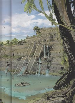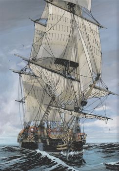 remarques: | sixième et dernier volume de la série Amazonie, 1743 Monsieur de La Condamine est de retour sans avoir trouvé l'Eldorado, pour lui c'est un mythe n.b. Charles de La Condamine 1701-1774 explorateur et scientifique françaais, célèbre pour avoir mené, de 1735 à 1743, une expédition géodésique (espace métrique) française en Équateur quant à Black Crow, il poursuit en 1778 son exploration en Amazonie à la recherche de l'Eldorado >> p. 16/17 en barque sur l'Amazonie mais au lieu de trésor, son équipe rencontre des marins fous de Dieu qui cherche aussi un trésor tout en inculquant par la violence la foi de leur Dieu >> p. 32/33 la découverte du temple au trésor finalement Black Crow et ses amis se débarrasseront de leurs concurrent en s'emparant du trésor et de la goélette du grand maître (seigneur oh seigneur, répété au moins 10x) avec leur butin, Black Crow se procurera une frégate en bon état pour poursuivre des aventures plus calmes >> p. 47 il est temps de se réconcilier avec son passé >> un texte répétitif et sans grand intérêt mais le graphisme reste magnifique, n'empêche que ce dernier volume n'améliore pas la série de Black Crow |