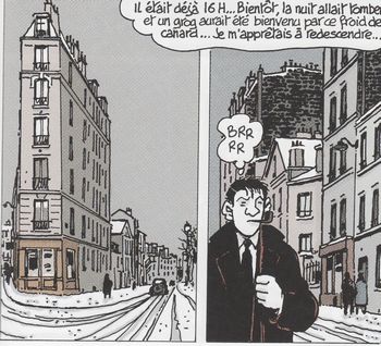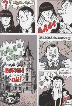 remarques: | dernier album de la série, couleur, 192 pages, dossier de 8 pages en fin d'album: Agence Fiat Lux Nestor Burma, bien enrhumé, enquête cette fois dans le 20ème arrondissement pré-Noël 1957, Nicole Manchol des établissements usines pharmaceutiques du même nom se suicide chez Burma après avoir flingué son mari le commissaire Faroux est sur les dents et se conduit très désagréablement envers Nestor Burma (d'habitude ils ont de bonnes relations) Burma enquête sur Nicole Manchol dont le papa était marchand de cochons et qui par la suite sera aussi assassiné, une première adresse: Biscorne = l'associé du mari de Nicole Manchol >> p. 41 les éternuements dégueulasses de Nestor Burma >> p. 78/79 une poursuite stupide >> p. 92/93 le laboratoire immonde des Ets Manchol-Biscorne avec trafic d'organes humains et expérimentation cruelle sur des animaux >> p. 97 petit voyou, si tu continues comme cela, tu deviendras ministre (dixit Nestor Burma plusieurs fois) s'en suit, une poursuite qui n'en finit pas après le sieur Burnel qui sera aussi retrouvé assassiné >> p. 156 du papier cul (hygiénique) >> p. 163 un building flat iron (fer plat) conclusion: une affaire de vengeance sur succession entre les marchands Manchol, Burlet, Biscorne et le gang des filous Grappier qui finit en queue de cochon >> une enquête au père Noël qui se traîne lamentablement, avec un pauvre texte répétitif sans intérêt, seul le graphisme sauve quelque peu l'album, mais c'est probablement le pire album de la série annexes - couverture de l'album - les éternuements de Burma - la 203 de Burma - le building flat iron - l'agence Fiat Lux - autoportrait de Nestor Burma |