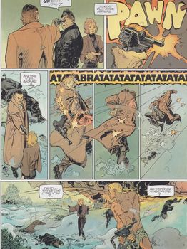 remarques: | la poursuite dure et persiste, réfugiés dans la maison de campagne d'Alice, nos fugitifs sont assiégés par des forces de police, mais parviennent de nouveau à leur échapper, fuite en caleçon pour le lièvre et prochaine étappe au mont St-Michel, aidé par un ami d'Alice qui veut cacher le lièvre dans un gabion = genre d'abri souterrain, mais la marée surprend le lièvre qui reprend sa course avec Alice en volant une 4x4 qui les conduit à Amsterdam >> p. 43 explications concernant le séjour sur Mars: on aurait inculqué au lièvre des images de synthèse peut'être par hypnose ou sous une autre autosuggestion fin du récit avec une nouvelle fuite fracassante et cette fois, le lièvre ne veut plus être gibier, mais prédateur sanguinaire n.b. comme si il n'y avait déjà pas assez eu d'hémoglobine nomenclature - fute (en argot) = genre de pantalon - surirrigation = irrigation excessive >> un scénario avec fuite continue qui reste encore acceptable tout comme le graphisme à noter qu'il n'y aura plus de réédition par la suite à partir du tome 3 |