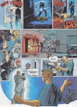 remarques: | en vol pour New York, Alice et le lièvre n'échappent pas à de nouveaux attentats, cette fois une explosion dans le hall d'arrivée de l'aéroport de la Guardia, ils en réchappent toujours et sont récupérés par le F.B.I. puis par la C.I.A. on apprend maintenant l'existence d'une 3ème puissance >> p. 28 les fous sont immortels puisqu'ils étaient déjà morts de leur vivant le lièvre est drogué à la tétrabenzol (qui remplacerait un détecteur de mensonges), puis sa vérité étant reconnue, embarqué dans un avion pour rencontrer le président des USA, l'avion explose, mais tous survivent >> p. 45 rencontre avec le président Bill Clinton en attendant que des recherches aboutissent, le lièvre et Alice qui n'est plus non voyante, sont envoyés sur une île déserte où normalement ils sont en sécurité, mais déjà des requins tournent autour de l'île >> fin du premier cycle, le développement du scénario prend du relâchement alors que le graphisme de Parras reste honorable avec de bonnes couleurs plasmatiques |