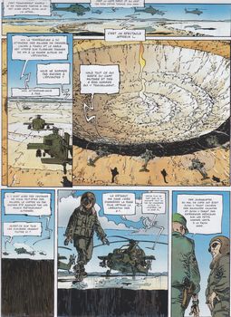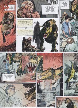 remarques: | une heure après l'explosion mini-nucléaire, David le lièvre est récupéré par l'armée, c'est le seul survivant, Keith est morte et Alice pratiquement aussi le président a toutefois aussi survécu et il engage un nouveau chef d'armée, le précédent général Goodman a été limogé, mais avec David il veut éclaircir le mystère du zoo dans la base secrète, sur leur route ils sont toutefois capturés par la garnison de Reno le président, transformé en monstre, se rend à Reno par téléportation afin de supprimer Goodman et David, l'armée ne veut plus lui obéir et ouvre le feu sur lui, il reste toutefois increvable et comme dans Terminator, ses morceaux peuvent se rassembler pour se reconstituer et seul un missile anti-personnel pourra le détruire temporairement >> p. 31 le président qui se transforme en tyrannosaure Rex et qui peut voyager à la vitesse lumière en dissociant ses atomes et en les reconstituant à l'arrivée le mystère du zoo reste inexpliqué et de retour à San Francisco pour alerter la presse avec >> p. 39 le super chasseur Mac 61 acte final: le lièvre qui a reçu des pouvoirs surnaturels, prend une autre identité et rencontre à l'hôpital, où Alice est entretemps décédée, avec un nouveau monstre qui se transforme en tyrannosaure et qui veut éliminer le lièvre, mais celui-ci comme par enchantement se volatilise >> un scénario qui s'étire indéfiniment avec le graphisme de Guera qui est moins affiné, mais toujours acceptable |