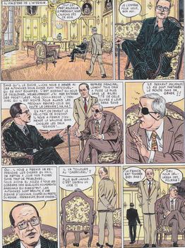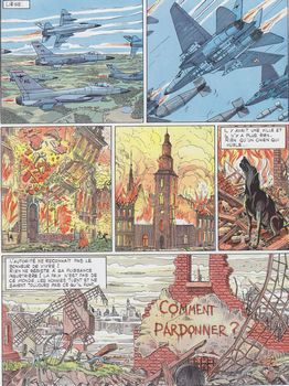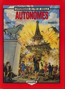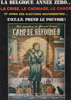 remarques: | série socio-politique sur scénario de Jan Bucquoy (chemin de la gloire, le bal du rat mort, Alain Moreau, Jaunes, Lou Strasse, Gérard Craan et Stone et graphisme de Jacques Santi (Gérard Craan et Jérôme Tailleriche) du terrorisme noir à outrance rappelant la bande à Baader française avec l'explosion de la Tour Eiffel et du réacteur atomique de Creys-Malville, mais si le thème était assez original, le texte est peu culturel et parfois mal orthographé >> p. 17 il échape >> p. 42 Lucas nous a mener avec des personnages copiés sur des acteurs de cinéma tel Gérard Depardieu et Patrick Dewaere >> premier album de cette série peu reluisante, il y eut trois albums de parus: mourir à Creys-Malville (1986) et Chooz (1988) une autre série parallèle aux chroniques est "une aventure de Gérard Craan" également par le duo Santi/Bucquoy (deux albums parus): 1/ camp de réforme B (1982) 2/ au Dolle Mol (1982) et un 3ème annoncé mais non paru: "le grand soir" ces deux albums non collectionnés ici annexes - couverture de l'album - pages de garde avec les bandes anarchistes de RAF (Roten Armee Fraktion), Autonomes, IRA (Irish Republican Army), Brigade Rosse, Action Directe et CCC (Cellules Communistes Combattantes) - extraits de page - couvertures des tomes un et deux "une aventure de Gérard Craan" Information politiquement, après une courte période de restauration, la Belgique s'est divisée en trois régions autonomes: - la Flandre opte pour un régime fort et autoritaire sous la bannière de la "Volksunie", parti national-libéral - Bruxelles et sa région reprennent le rôle de capitale internationale - la Wallonie se choisit une démocratie populaire innovant dans le domaine de l'écologie, des énergies non-polluantes, de la révolution sexuelle, de l'autogestion et de la participation de ses habitants aux destinées de la nation cette histoire relate les actions d'un groupe anarchiste belge: autonomes, les partis extremistes de droite se retrouvent à nouveau en force dans la vie politique, la France profite de l'escapade amoureuse de la fille d'un de ses dirigeants pour envahir sa voisine du nord (la Wallonie) Bucquoy reprend, encore une fois, le thème du faschisme et de l'action anti gouvernementale anarchiste en Belgique |