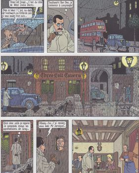 remarques: | cette fois le parfait album policier style roman noir sur fond d'affaires économiques (héritage) avec histoire d'amour Londres 1956 le célèbre éditeur Harding est assassiné dans un taxi par une femme mystérieuse portant un voile noir, l'enquête est menée par Scotland Yard en parallèle avec Albany et Olivia Sturgess, la fin de l'épisode est très imprévue dont la découverte du meurtrier par l'intermédiaire du livre "ghost stories" by Mrs. Gaskell et l'apparition de l'idiot du village en fin de récit, ce qui arrange bien les choses! >> p. 5&6 participation d'Agatha Christie et d'Hitchcock en page 23 + page de garde >>> toujours un bon scenario (mais véritablement complexe) et un très bon graphisme |