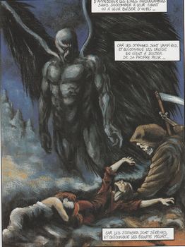 remarques: | Washington 1997, Combrie secrétaire à la défense au Pentagone se fait éliminer par un être mystérieux (1ère apparition d'un stryge dans la série) pour n'avoir pas rempli son contrat tandis que Debrah essaie de convaincre la veuve Grosvenor de l'aider pour faire toute la lumière sur le meurtre de son époux; rencontre Kevin, Josh et Gallagher, le chasseur, tous les trois sont peu après enlevés par les hommes du président à la Maison Blanche, Kevin a une entrevue avec le président qui s'excuse de l'avoir laissé tombé, il veut le dédommager mais le prie d'abandonner l'affaire (le Pentagone désirant garder le silence sur ces évènements) et lui offre des vacances en le confiant à Nolan, son homme de main, qui s'occupera de tout, Kevin Nivek est réintégré dans la sécurité mais doit prendre des vacances alors que Josh et Gallagher sont libérés >> p. 17 vraiment peu de monde dans le Grand Hotel Kevin fausse toutefois compagnie à Nolan et rejoint Melly dans leur refuge où ils sont rejoints par Debrah qui est sur une piste >> p. 20 mention à nouveau de la mystérieuse silhouette sur des photos, toutefois peu distincte prochaine destination: l'Amérique du Sud où Grosvenor a été assassiné, Melly est confiée à Josh et à Gallagher qui lui montre son tableau sur la mystérieuse créature qui a été dessiné par un individu qui a reçu le baiser de l'oubli et qui a sombré dans la folie (on ne nous montre pas encore ce que représente le tableau) au Pérou, Kevin et Debrah se heurtent à l'incompréhension des indigènes et subissent même une tentative d'assassinat, finalement ils réussissent à trouver un guide qui les conduira au pic où devrait se situer un repaire des stryges, mais le guide sera agressé et mis hors combat >> p. 41 l'attentat du guide par un stryge et l'indice resté dans la main du guide, celui-ci s'en sortira mais sombre dans la folie de retour à Washington, Kevin et Debrah expliquent à Josh et Gallagher l'échec de leur mission mais ils en rapportent un débris de plume de stryge! ils décident de poursuivre leur recherche et surtout à se préparer maintenant à une prochaine rencontre avec les stryges, Kevin est toutefois à nouveau repéré par Nolan >> p. 48 en fin d'album, on a droit au fameux tableau de Gallagher qui montre une peinture en forme de stryge et le message: "les stryges sont vampires et sirènes et quiconque les écoute meurt" >> première apparition visuel de stryge dans l'album, l'action se précise, le suspense demeure, on a droit à quelques leçons d'alpinisme, toutefois à noter un graphisme qui s'améliore avec un bon jeu de couleurs n.b. pages de garde: les stryges dans le folklore roumain, considérés comme des vampires ou "strigoï" (=sorciers) |