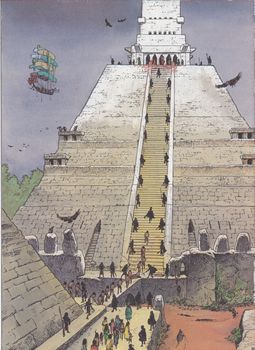 remarques: | arrivée à Majaxatl, Thorgal refuse de tuer Ogotaï, Kriss s'allie alors avec le général Hog, opposé à Ogotaï et fait capturer Thorgal, Aaricia et Tjall qui, lui, réussit toutefois à s'échapper Thorgal et Aaricia sont destinés à être sacrifiés au dieu Ogotaï par les grands-prêtres et par Nazca, chef des gardes noirs >> p. 25 la pyramide des sacrifices ils seront sauvés par Tjall qui meurt toutefois dans l'action et tous les trois se retrouvent dans le labyrinthe du palais d'Ogotaï Kriss de Valnor devient la victime d'Ogotaï >> p. 40 la peur secrète de Kriss de Valnor: la vieillesse qui devient une vieille femme centenaire de par les pouvoirs d'Ogotaï confrontation finale entre Thorgal et Ogotaï et ce sera Kriss de Valnor qui donnera le coup de grâce à Ogotaï en employant une de ses armes secrètes: un pistolet à rayon foudroyant >> p. 47 avant de mourir, Ogotaï reconnaîtra enfin son fils (une case assez émouvante) et en couverture de l'album ainsi qu'en p. 33 la mort de Tjall (tout aussi émouvante) Thorgal et Aaricia se rendent alors à Xinjin rejoindre Jolan et Arghun en emportant toutefois avec eux la vieille Kriss de Valnor >> un album tout à fait de bonne allure avec toujours un excellent graphisme |