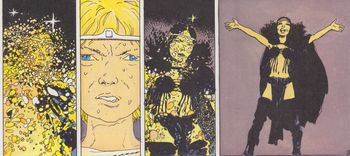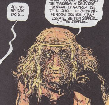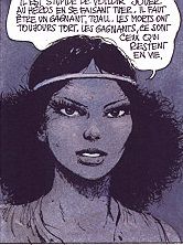 remarques: | de retour chez les Xinjis, Thorgal est confronté avec Uebac qui a renversé le régent Variay et qui veut garder Jolan pour son pouvoir personnel Uebac fait arrêter Thorgal, Aaricia, pied-d'arbre et le régent, il les condamne à mort en les exposant à la bouche du soleil (une cavité dans une falaise garnie de cristal qui réflète la lumière du soleil en les faisant mourir lentement et douloureusement tandis que Uébac essaie de faire croire à Jolan que ses parents sont partis subitement, ne voulant pas entraver le destin de Jolan mais grâce aux petites amies de Arghun, tous réussiront à s'en sortir tandis que Kriss de Valnor, rendue à sa jeunesse par le pouvoir de Jolan, s'enfonce avec son trésor dans le désert sans espoir de survie au final, Arghun voudra vouloir finir ses jours chez les Xinjin alors que Thorgal, Aaricia et Jolan repartiront vers leur ancien domicile >> fin du cycle de Qâ avec à nouveau un bon album tant pour le scénario que pour le graphisme annexes - la couverture de l'album avec la bouche du soleil - les transformations de Kriss de Valnor |