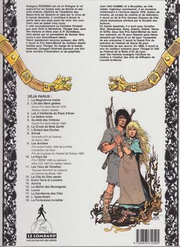 remarques: | Thorgal a recouvert son aspect antérieur en se rasant soigneusement, il décide de quitter Kriss (qui vient de passer un mauvais moment) et de repartir retrouver sa famille, mais sur son chemin, Thorgal rencontre la vieille femme Alayin qui lui révèle le secret de la pierre de mémoire des dieux où est incrit le nom de Thorgal >> p. 13 Thorgal protégé, mais suivi par les dieux Alayin lui propose de rayer son nom sur cette pierre afin que Thorgal ne fasse plus parti du destin des dieux et puisse enfin trouver la paix sur ce monde, mais pour cela, il faut encore qu'il atteigne la forteresse invisible ce sera d'épiques aventures pour Thorgal où il rencontrera tous les souvenirs de ses précédentes aventures mais de retour du domaine des dieux, Thorgal a perdu la mémoire et c'est Kriss de Valnor qui le prend sous son emprise et en fait le guerrier au nom de Shaïgan-sans-merci >>> un album assez intéressant qui ouvre un nouveau cycle dans les aventures de Thorgal-Shaïgan avec une touche d'érotisme dans l'album qui dévoile la beauté de Kriss de Valnor annexes - couverture de l'album - dos de l'album: le couple Thorgal-Aaricia encore sans famille (alors que Jolan et Louve sont déjà là) |