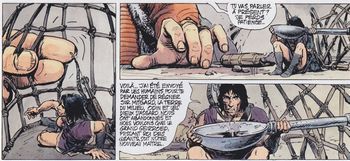 remarques: | retrouvailles avec Galathorn, prince de Brek-Zarith, qui a été capturé par les hommes de Shaïgan grâce à Galathorn, Shaïgan-Thorgal apprend sa véritable identité, il veut alors quitter Kriss et sa vie de pillages, pour cela, Thorgal demande aux dieux de lui rendre son nom il sera entendu par la déesse Frigg qui toutefois pour pouvoir intervenir auprès d'Odin lui demande de récupérer l'anneau Draupnir, le bracelet sacré d'Odin, qui lui a été dérobé lors de la grande bataille entre les dieux et les géants >> p. 21 l'entrevue de Thorgal avec la déesse Frigg qui lui explique que Thorgal a déjà été mort trois fois et que par trois fois sa vie lui a été rendue >> p. 22 la bataille entre les dieux et les géants: Ragna Rokkr, le crépuscule des dieux Thorgal accepte la mission, mais pour l'effectuer, il doit se rendre au pays des géants et après bien des mésaventures chez les géants, le minuscule petit homme réussira à ramener l'anneau il retrouvera alors son identité et le signe brûlé sur la paume de sa main disparaîtra, il pourra repartir avec Galathorn vers de nouvelles aventures n.b. un fourré = arbuste,bosquet >> un récit de contes de fée, teinté de mythologie avec la participation des walkyries, des démons et des géants, mais toujours assez intéressant et bien dessiné annexes - couverture de l'album - Thorgal chez les géants |