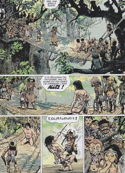 remarques: | sur une terre inconnue, Jolan est mordu par un rat et est frappé d'une maladie inconnue, le mal bleu >> le récit est maintenant en partie raconté par Jolan >> p. 9 à 12 nos amis sont attaqués par des nains-pirates ils seront sauvés par le prince Zarkay, héritier du royaum de Zhar qui tombe un peu amoureux d'Aaricia, mais quand il découvre que ses hôtes sont frappés de la maladie bleue, il les fait jeter dans une fosse où croupissent déjà les gens atteints du mal bleu >> p. 21 le rocher de la délivrance où les mourants sont soulagés de leur peine (un genre exit du passé) Thorgal, qui n'est pas encore contaminé, décide de lutter contre ce mal, il réussit à s'échapper de la fosse et après avoir rencontré Zajkar, frère jumeau de Zarkaj, Thorgal se met en route vers la montagne au toit de neige où se trouve le mage Armenos qui détient une potion qui guérit du mal bleu après bien des mésaventures dont un combat contre Quarl, le roi des nains-pirates et contre le dragon-pieuvre, >> p. 35 un curieux duel Thorgal parviendra à obtenir la potion et à rejoindre par vol delta les malades frappés du mal bleu qui seront sauvés bref tout était bien qui finissait bien, tout le monde était heureux dont les frères jumeaux Zarkaj et Zajkar réconciliés et le quatuor reprend sa route vers le sud >>> un album assez intéressant et au thème plutôt original avec au début quelque résumé des aventures précédentes annexes - couverture de l'album - le combat entre Thorgal et le roi-nain Information le nanisme est une condition caractérisée par une très petite taille chez un être vivant (végétal ou animal), il résulte d'un ralentissement ou d'un trouble de la croissance lié à une condition héréditaire ou accidentelle (maladie, carence, environnement) le mot nain provient du latin nanus et du grec nanos = petit, lilliputien est une forme de nanification = rendre nain |