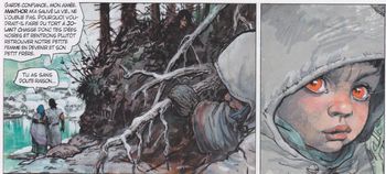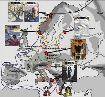remarques: | Jolan en rejoignant Manthor laisse derrière lui son enfance et s'apprête à faire façe à l'avenir qui lui réserve un destin exceptionnel et Jolan avec Manthor découvre sa première épreuve: parvenir au château surnaturel de Manthor en 3 jours et fouler le seuil de l'initiation, sur son parcours, Jolan rencontrera 4 autres candidats: - Arlac fils de duc - Draye l'esthète avec un pied artificiel - Ingvild la jeune femme-archer et - Xia la femme-barbare le premier obstacle ne pourra être vaincu que par l'ensemble des candidats qui devront coordiner leurs offensives entretemps, dans le monde de Thorgal, Aaricia est inquiète pour Jolan et décide de consulter la magicienne Mahara à la clairière des chats >> p. 39 la magicienne Mahara et ses nombreux chats qui révèle à Aaricia la véritable histoire de Kahaniel, le maître de la magie rouge et de sa femme Vylnia, une déesse de seconde catégorie qui furent les parents de Manthor n.b. le nom complet de Kahaniel est Kahaniel de Valnor sa femme exilée par Odin pour avoir aimé un mortel, Kehaniel sera lui-même transformé en statue, toutefois Vylnia avait pu s'emparer du livre de la magie rouge avant d'être exilée dans l'entre-monde ce qui fut profitable à son fils Manthor qui en grandissant assimila les secrets de la magie rouge et il aurait juré de se venger des dieux qui ont chassé sa mère, est-ce dans ce but qu'il compte utiliser Jolan? d'un autre côté, pour pouvoir se réincarner, Kahaniel de Valnor paya grassement une jeune femme nommé Olgave pour qu'elle accepte de porter son enfant et qu'elle promette de lui donner son nom et cette enfant sera une fille qui s'appellera Kriss de Valnor (>> voir la série Kriss de Valnor pour la vie de Kriss) et Kriss de Valnor enfanta de Thorgal son fils Aniel qui est présumé maintenant réincarner son grand-père Kahaniel de Valnor, le maître de la magie rouge quand l'enfant aura atteint l'âge de 10 ans >> n.b. ouf quelle histoire! chez Manthor, celui-ci informe ses élus de la nouvelle épreuve qu'ils devront subir au terme de laquelle le vainqueur sera l'élu d'exception >>> scénario et graphisme très respectable et Sente a déjà de la suite dans les idées annexes - couverture de l'album - père et fils réunis - les yeux rouge vif de l'étrange Aniel - la carte des itinéraires des derniers albums |