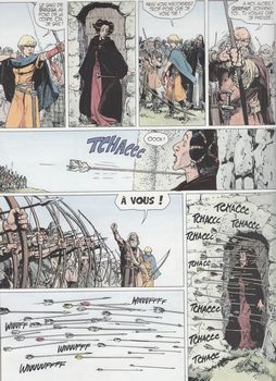 remarques: | Ier cycle, série Sioban prologue: mort de Sioban, sa mère lady O'Mara en ne voulant pas allumer son bûcher funéraire refuse à Sioban le voyage vers le domaine des dieux quelque temps auparavant, le mariage entre Sioban et le prince Gerfaut avait été célébré mais Sioban avait été droguée par dame Gerfaut ne connaissant pas l'intrigue, Kyle of Klanach, déçu, décide de quitter la cour >> p. 5 le mariage de Sioban et du prince Gerfaut >> p. 7 le désespoir du petit ouki >> p. 8 le plat assaisonné à l'ouki en miel >> p. 14 la patte de bouc du prince Gerfaut >> p. 20 l'apparition des schlimrocks (genre de rats) dûe à la perte des pouvoirs de Sioban en s'accouplant au prince Gerfaut sous l'insistance de Seamus, Kyle de Klanach accepte de rester à la cour mais ne veut pas jurer fidélité au nouveau prince et est arrêté par ordre de Sioban, puis mis à la torture Seamus et Merry, amie de Kyle, décident de libérer Kyle ils y réussiront grâce à l'aide du partisan Vorta, mais Merry et Sioban y perdront la vie toutefois leur action n'aura pas été inutile grâce à sa mère, Sioban revient à la vie par l'action combinée de son père et de la destruction de la bague de Brigga Sioban reprend le pouvoir, dame Gerfaut est mise à mort et le prince Gerfaut est dévoré par les oukis mais Sioban retrouvera-t-elle l'amour de Kyle of Klanach et ne porte-t-elle pas déjà en son sein l'enfant du prince Gerfaut? >>> on ne le saura pas, ce volume finissant le premier cycle de la complainte des landes perdues, Rosinski quitte aussi la série et le prochain cycle "les chevaliers du pardon" sera repris par Philippe Delaby avec ce quatrième volume finit le cycle avec brio tant pour le scénario que pour le graphisme à noter dans le scénario: l'exécution de Sioban par Merry qui ne veut pas céder au chantage de dame Gerfaut le mal bien triomphe du bien mal |