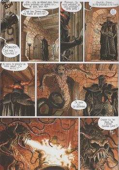 remarques: | IIème cycle, série les chevaliers du pardon ce nouveau cycle reprend les aventures dans le pays d'Eruin Dulea avant la naissance de Sioban avec les débuts de Seamus, chevalier du pardon dont le premier objectif sera avec son compagnon Sill Valt, un chef de clan, de chasser les sorcières = moriganes de leur pays moriganes = sorcières de premier sang mais nous ne connaîtrons pas la suite des aventures de Sioban une vieille sorcière "Mornoir" emprisonnée dans un puit prédit à Seamus un grand courage mais il sera trahi par un grand amour >> p. 10 Seamus qui a un cygne noir comme mascote >> p. 12 la consultation auprès de la sorcière Mornoir ailleurs un chasseur de sorcières consulte Luchorpain, la gardienne des trésors perdus, pour se procurer un masque de Vusald afin de mieux pouvoir retrouver et éliminer une sorcière-morigane, mais c'est le chasseur qui sera chassé et supprimé par la morigane >> p. 41 l'attaque de la morigane ce ne sera que plus tard, grâce à la perspicacité de Seamus et après une enquête approfondie que la véritable morigane sera éliminée en pleine action de sorcellerie après avoir reçu dans son oeil gauche qui contient le Chiil, une flèche percutante >> p. 53/54 la mort de la morigane (la vraie car il y a de fausses moriganes, de second sang) >> un récit mythologique mystico-satanico qui commence aux origines du pays de l'Eruin Dulea et au début de la complainte des landes perdues mais qui n'en donne pas vraiment beaucoup de détails si le graphisme de ce premier album du 2ème cycle (6 ans après le 4ème volume du 1er cycle avec Rosisnki) est parfaitement exécuté par Delaby, le scénario de Dufaux se perd un peu dans les landes où le lecteur se complaint on nous annonce encore 3 volumes pour compléter ce 2ème cycle |