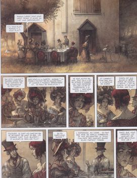 remarques: | biographie de Hugo Sambre dont l'arbre généalogique figure sur le 4ème plat de l'album, titre de ce premier volume: le mariage d'Hugo (cette nouvelle série est créée par Yslaire, mais assisté pour le dessin par Bastide et Mézil, édition Futuroplolis en collaboration avec Glénat) début d'une nouvelle série: la guerre des Sambre qui se développe en trois chapitres 1) première génération (Hugo et Iris) 2) 1er degré d'ascendance (Werner et Charlotte) 3) génération de Cujus (Maxime-Augustin et Constance) pour le détail de ces trois chapitres, voir le tome 1 "plus ne m'est rien" n.b. seul le premier chapitre (Hugo et Iris) est collectionné sur le site 1/ introduction, mai 1857 chez sa tante à la Bastide, Bernard-Marie blessé à l'oeil gauche rêve souvent de sa mère Julie qui est exilée en Guyane et dont la tante fait croire à Bernard-Marie que sa mère est morte 2/ le mariage d'Hugo, printemps 1830 Hugo, le dernier des Sambre, fils de Maxime-Augustin se marie le 20.4.1830 avec Blanche Dessang, fille d'Armand Dessang, propriétaire de mines de charbon et ancien grognard de Napoleon comme dot, Hugo reçoit les mines de charbon et de cuivre ainsi qu'un paquet d'actions >> p. 17 la misère des mineurs >> p. 20/21 les conditions de travail des mineurs rencontre avec Horace Saintonge, dit le vicaire, contremaître des mines et qui deviendra plus tard le secrétaire et ami intime d'Hugo lors d'une visite des mines, Hugo découvre des peintures rupestres et des ossements humains dont le crâne d'une femme qui a un oeil rouge de par la fixation d'un rubis dans l'orbite, ce qui causera l'attirance d'Hugo pour l'archéologie >> p. 36 description de la femme de Maxime-Augustin: Constance et leurs trois filles Victoire ainsi que les jumelles Hortense et Camille n.b. erreur du 4ème plat qui mentionne Honorine au lieu d'Hortense naissance de Sarah, fille d'Hugo et Blanche, Honorine, uen domestique, deviendra sa nourrice, à la suite d'une dispute avec son père, Hugo s'installe à Paris avec son serviteur Theodore, il y fera la connaissance d'Iris, une actrice de théâtre et chanteuse d'opéra, une femme aux yeux de couleur rouge-sang >> le scénario, bien que typiquement biographique, reste intéressant tout comme le graphisme qui ne peut toutefois pas égaler celui d'Yslaire dans la première série des Sambre la tendance d'Yslaire au romantisme à l'allemande et au rouge et noir de Stendhal s'affirme (rouge comme l'amour, noir comme la mort) Information la guerre des Sambre fait partie de la collection Sambre, Yslaire est toujours le scénariste mais il a confié les dessins à Jean Bastide et Vincent Mezil pour le cycle d'Hugo & Iris, à Marc-Antoine Boidin pour le cycle de Werner et Charlotte ainsi que Maxime & Constance et il devrait se charger de celui de Aam et Yev la guerre des Sambre raconte l'histoire d'Hugo et Iris, parents respectifs de Bernard et Julie, personnages de Sambre, puis celle de Werner et Charlotte, parents de Maxime-Augustin (père de Hugo) la guerre des Sambre est une saga familiale centrée sur la passion amoureuse, dans ce qu'elle a de plus destructeur, le cycle d'Hugo et Iris relate l'origine de la malédiction qui touche les Sambre, tout en expliquant la genèse de ce fameux livre que Hugo avait conçu: la guerre des yeux |