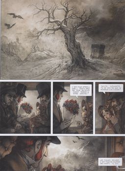 remarques: | 2ème volet de Hugo et Iris (la guerre des Sambre): la passion selon Iris, automne 1830, récit qui s'apparente plutôt à la série des Rougon-Macquart de Zola qu'au rouge et noir de Stendhal à Paris, rencontre d'Hugo avec l'actrice Fenella, surnommée Iris aux yeux rouges, la théorie du culte des yeux rouges comme développé par la déesse babylonienne Ishtar >> p. 11 les fleurs qu'il faut offrir à Iris pour la séduire: une sorte d'iris, surnommés les roses Khazares au prix exorbitant mort de Maxime, père de Hugo et rencontre avec sa demi-soeur Judith-Egalité, première épouse de Maxime, et de son fils Hyppolite Guizot qui deviendra chef de police à Paris la passion de Hugo avec Iris se développe, l'origine des yeux rouges de Iris et l'histoire de la guerre des yeux dans le passé, début du roman d'Hugo: la guerre des yeux >>p. 36 explication détaillée sur l'origine des yeux de couleur rouge-sang mort de la mère d'Hugo, Constance et la folie commence à envahir Hugo, toujours assisté de Horace Saintonge, son ami intime et de Théodore, son serviteur >> un assez bon scénario qui a toutefois perdu quelque peu de son charme, le graphisme restant toujours respectable n.b. le quatrième plat a été corrigé, Hortense remplace maintenant Honorine Information - Hugo Sambre assiste à toutes les représentations données à l'Opéra Comique de Paris, soir après soir, dans le seul but d'admirer les yeux rouges d'Iris l'actrice vedette, il reporte sans cesse son départ pour se rendre au chevet de son père à l'agonie, - le sentiment qu'il éprouve pour la belle Iris commence déjà à le dévorer petit à petit, il délaisse sa femme et sa fille pour se consacrer entièrement à son nouveau projet: écrire un roman dont le titre sera "la guerre des yeux" - Yslaire dépeint avec une grande justesse ce sentiment amoureux teinté de mélancolie propre au XIXème siècle, le jeune homme est prêt à tout pour rencontrer cette femme si mystérieuse, jusqu'à se ruiner pour satisfaire ses désirs les plus fous |