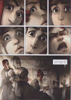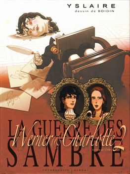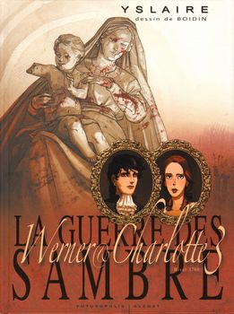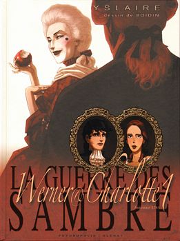 remarques: | 3ème volet et fin du cycle Hugo et Iris, titre du tome 3: la lune qui regarde, hiver 1831 Blanche délaisse sa fille Sarah et son mari Hugo en prenant un amant qu'elle fait passer pour son neveu Alfred, Hugo retourne à Paris et sa liaison avec Iris s'affirme alors que Horace lui déconseille de continuer sa liaison avec Iris Hugo continue ses frivolités avec Iris et commence à dilapider sa fortune au jeu >> p. 31 interlude: la visite au jardin des plantes avec les races de babouins aux yeux rouges et aux yeux noirs qui ne veulent pas s'accoupler >> p. 44 la sanguine = la guillotine nouvel évènement: Hugo découvre que Horace fait aussi partie des amants d'Iris sous le nom du baron de Morbleu, Hugo le renvoie >> p. 53 apparition de la fameuse épingle à cheveux, peut'être la véritable vedette de la série enceinte, probablement d'Hugo, Iris met au monde une petite fille qu'elle appellera Julie, Hugo retourne à la Bastide sans revoir Iris Bernard, né un peu plus tard, sera la dernière relation d'Hugo avec Blanche et peut'être même le fils d'Alfred, l'amant de Blanche Hugo sur son lit de mort révèle à sa fille Sarah son histoire avec Iris et lui confie ses écrits comprenant surtout "la guerre des yeux" >> p. 58 mention de Aam, l'ancien guerrier préhistorique aux yeux rouges (qui aurait dû être le thème d'une série, mais qui ne paraîtra pas), concernant les diverses séries imaginées par Yslaire, voir Sambre tome 1 1/ épilogue - Hugo Sambre s'éteignit le 27.11.1847 dans sa maison natale de la Bastide, la fin de sa vie fut une longue agonie, suite à un suicide manquée, on murmura qu'il était mort fou en se crevant les yeux - quant à son fils Bernard, aujourd'hui encore on parle de la passion qui l'unit à l'orpheline Julie Saintange, passion qui mena aussi Bernard et Julie à leur perte, suivant ainsi le chemin de son père, Bernard était tombé aussi amoureux d'une fille aux yeux couleur rouge-sang 2/ repères chronologiques sur la famille Sambre - de la croisade de 1099 avec le chevalier Hubert de Sambre, puis on retrouve lors de l'Inquisition au XVème siècle un certain Goetz von Samber, chevalier dans l'empire teutonique, c'est de lui que vient la devise: Sambre au clair, la lune te regarde - enfin au temps des lumières en 1715, on trouve Augustin de Sambre, un familier du Régent, mais suite à une sombre (sambre) affaire, il s'exile en Belgique, c'était le père de Maxime-Augustin dont la fille Charlotte marie un noble autrichien: Werner von Gotha, ce sera la série Werner et Charlotte - leur fils Maxime-Augustin se marie en première noce avec Louise-Marguerite Collée, ils eurent deux fils qui meurent sous la guillotine durant la Révolution, seule leur fille Judith-Egalité survivra, mariée à un certain Guizot, elle donnera naissance à Hyppolite Guizot, Maxime divorce et se remarie avec Constance van Loo, une proche de Danton, ils auront trois filles: Victoire et deux jumelles Hortense et Camille ainsi qu'un fils Hugo Sambre qui se marie avec Blanche Dessang, fille d'un propriétaires de mines de charbon, ce sera la série Maxime-Augustin et Constance 3/ la guerre des yeux - c'est le nom de cette oeuvre maudite de Hugo Sambre, le livre décrit cette première guerre de l'humanité, opposant des tribus originelles selon la couleur de leurs yeux, et la malédiction qui s'acharne sur les survivants, le destin qu'elle entraîne pour leurs descendants, siècle après siècle - ainsi chaque génération de la famille Sambre reproduirait inconsciemment ce premier conflit, chaque ancêtre aux yeux noirs a en effet connu une passion fatale avec un descendant ou une descendante aux yeux étrangement rouges >> bien que le graphisme soit toujours convenable, le scenario n'apporte rien de très nouveau, s'éternisant quelque peu sur les rapports entre Hugo et Iris, le supplément en fin d'album apporte quelques éclaircissements sur l'arbre généalogique et l'histoire de la famille Sambre avec la dissertation du livre "la guerre des yeux" annexes - couverture de l'album (pas de changement au 4ème plat) - extrait de page aux yeux noirs des Sambre - couvertures des trois albums série Werner et Charlotte, tome 1, l'éternité de Saintange, automne 1768 (2010) tome 2, la messe rouge, automne 1768 (2011) tome 3, votre enfant Comtesse, hiver 1768 (2012) - couvertures des trois albums série Maxime-Augustin et Constance tome 1, la fiancée de ses nuits blanches automne 1775 (2014) tome 2, le petit jour de la mariée hiver 1781 (2015) tome 3, le regard de la veuve été 1794 (2017) le scénariste reste Yslaire, mais le graphisme est effectué par Marc-Antoine Boidin (entre autres dessinateur de la série Kerioth de science-fiction) les deux séries ci-dessus ne sont pas collectionnées sur ce site |